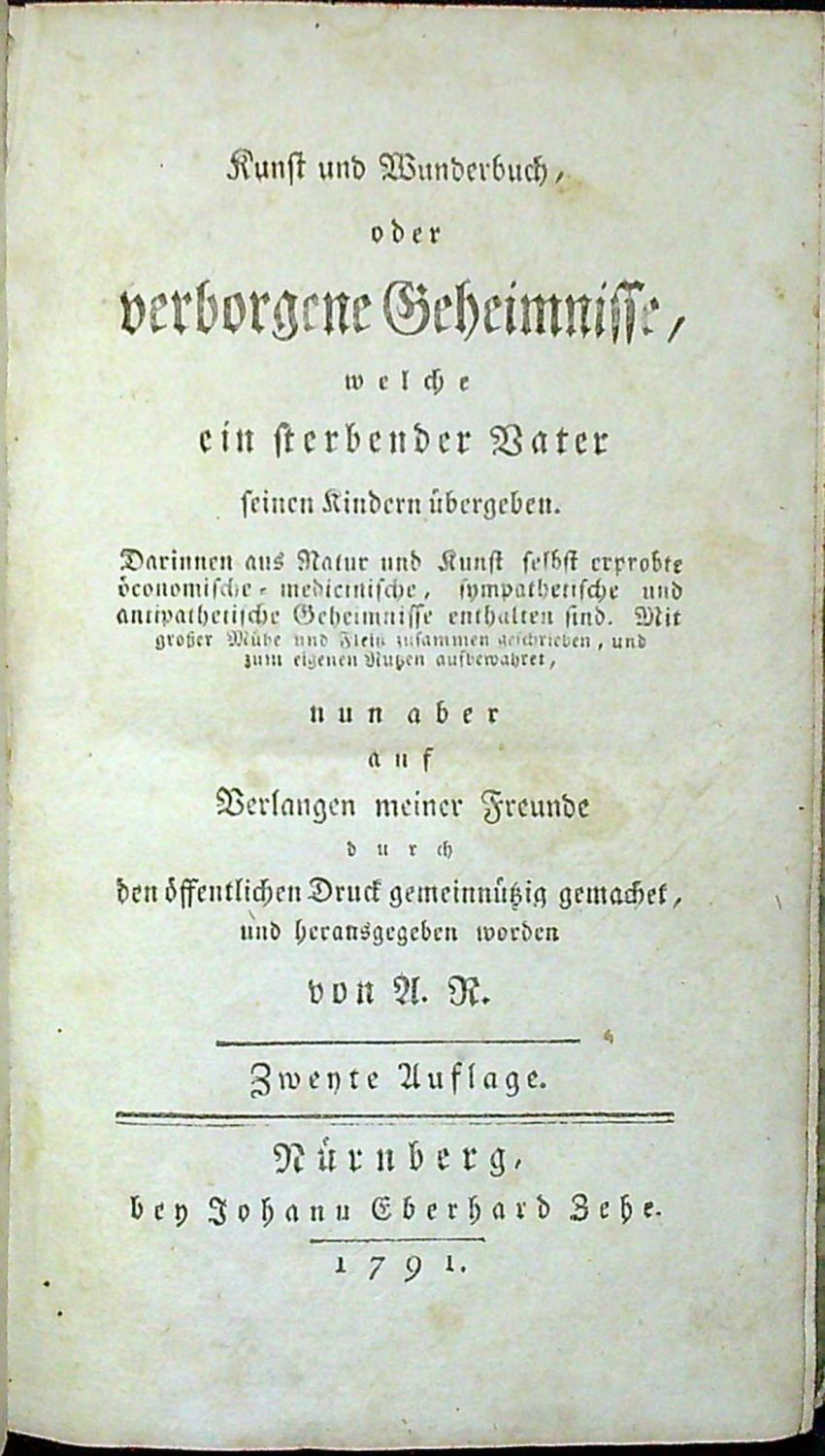 Kunst und Wunderbuch, oder verborgene Geheimnisse, welche ein sterbender Vater seinen Kindern übergeben. Darinnen aus Natur und Kunst selbst erprobte öconomische=medicinische, sympathetische und antipathetische Geheimnisse enthalten sind. Mit grösser Mühe und Fleiß zusammen geschrieben, und zum einigen Nutzen aufbewahrer, nun aber auf Verlangen meiner Freunde durch den öffentlichen Druck gemeinnützig gemachet, und herausgegeben worden von A. R. (II. Theil ?)
