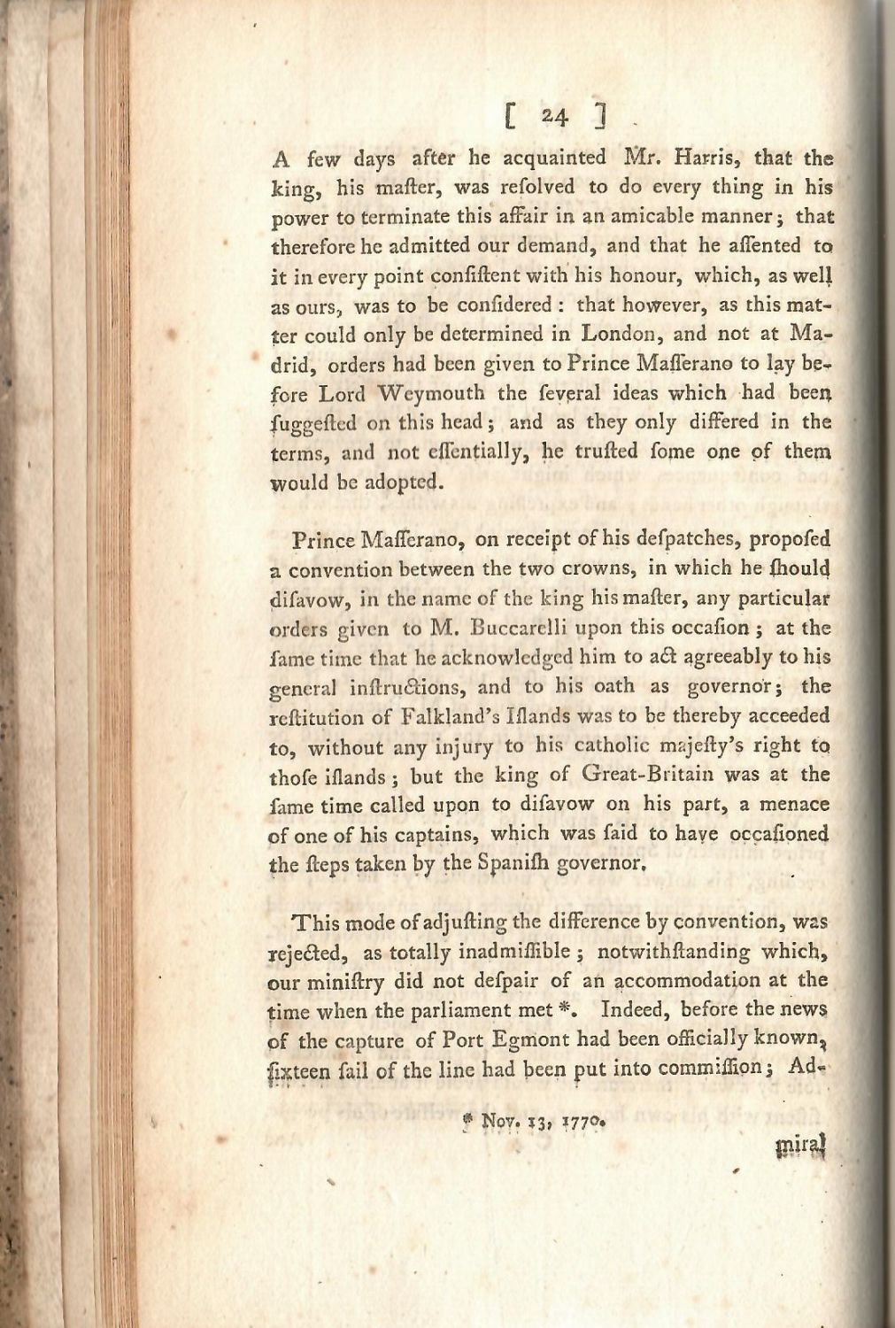 Za stranou 169 II. díl průběžně paginovaný, tučně tištěné versálky ve výši 2 řádků, arabská paginace stran uprostřed horního okraje v hranatých závorkách. <br>+ přívazek: "The Constitutions of the several independent States of America; the Declaration of Independence; the Articles of Confedaratin between the said States; The Treaties between his most christian Majesty and the United States of America. Published by Order of Congress. Philadelphia printed: London reprinted, with an Advertisement By the Editor". For J. Stockdale, in Piccadilly; and sold by J. Walker, No. 44 in Pater-noster-Row, 1783, [VIII]-168 stran.<br>Dobová vazba s kartonovými deskami, kožený hřbet, ve hřbetu 5 vazů, jednotlivá pole olemovaná jednoduchou zlacenou linkou, ve druhém poli vínově červený kožený štítek s tlačeným a zlaceným názvem. Vazba místy odřená a podél hřbetu kůže místy popraskaná. Papír na přední předsádce přeložený a předním nepotištěném vakátu zčásti natržený.<br>Frederick North, 2. hrabě z Guilford (13.4. 1732 Londýn - 5.8. 1792 Mayfair, dnes součást Londýna), významný britský politik, ve vládě zastával řadu funkcí, mimo jiné byl ministrem vnitra a kancléřem státní pokladny. V letech 1770 až 1782 byl premiérem Velké Británie.