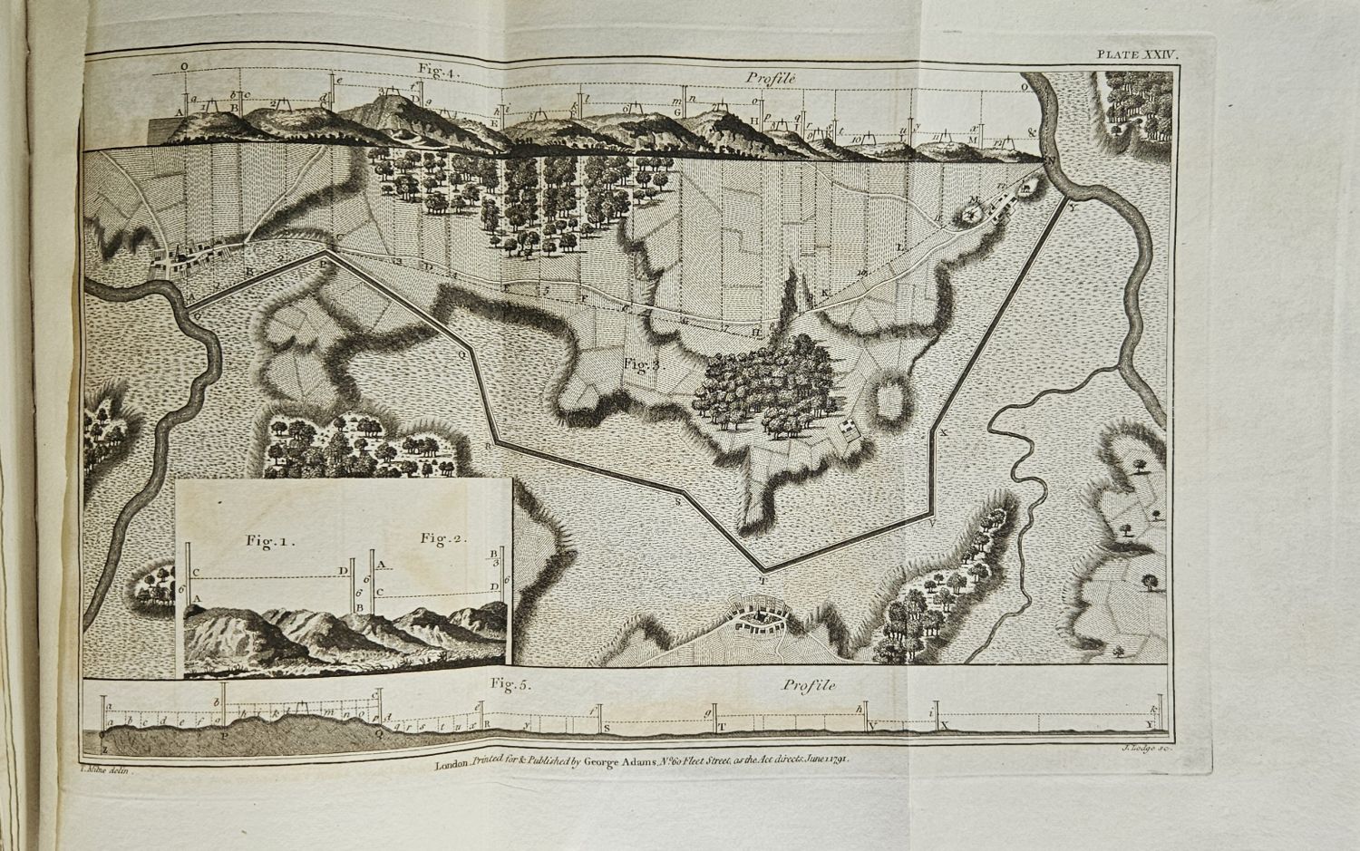 Dobová kartonová vazba potažená světle modrým škrobovým papírem, místy pap. pokryv odřený, ve hřbetu chybí zcela, naražené rohy, přední deska od šitého bloku rozvolněná, zadní uchycená pouze u prvního vazu, jinak uvolněná. Knižní blok neoříznutý.<br>George Adams, mladší (1750 - 1795) anglický vědec, optik, vědecký spisovatel a výrobce matematických přístrojů a glóbů.