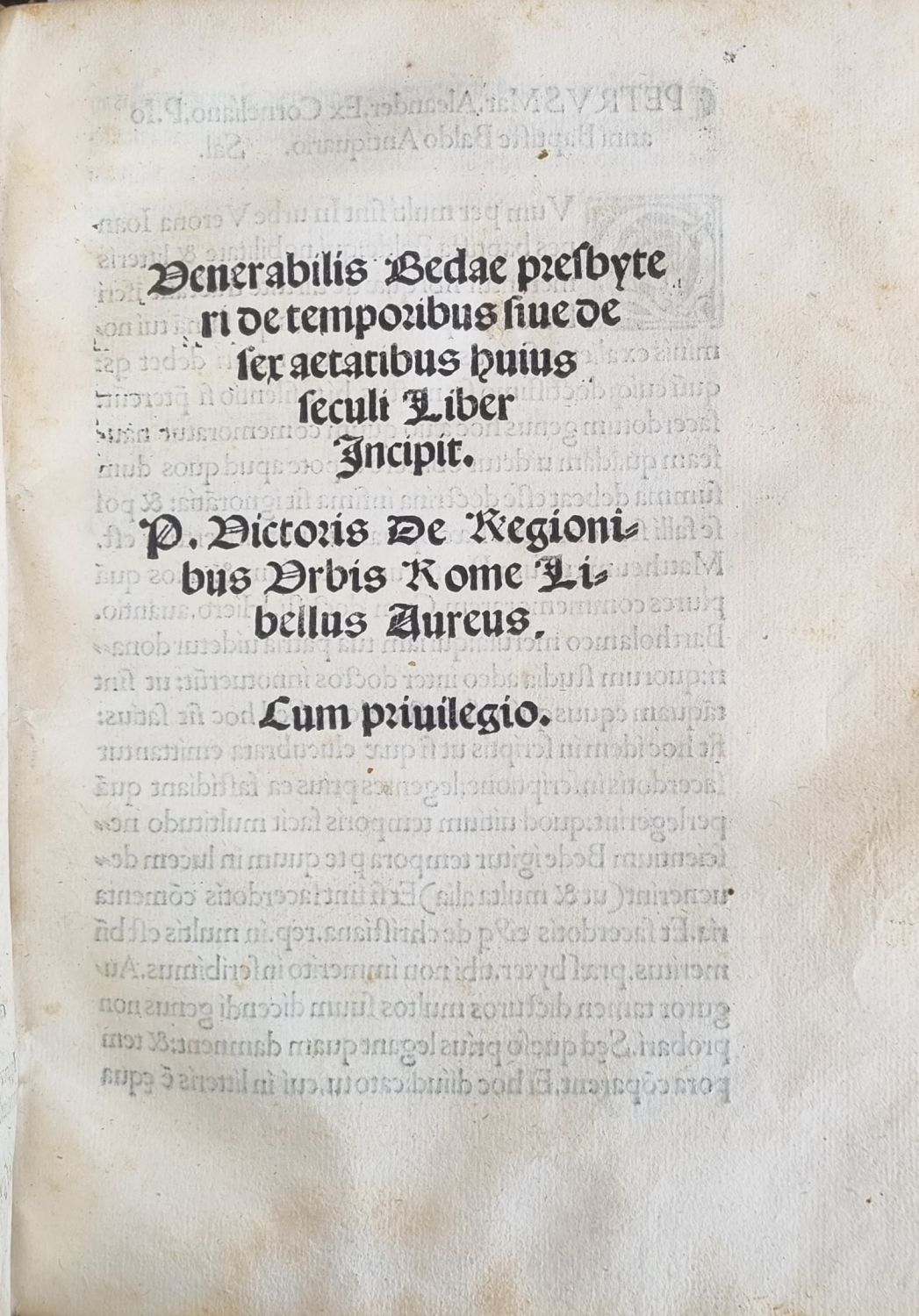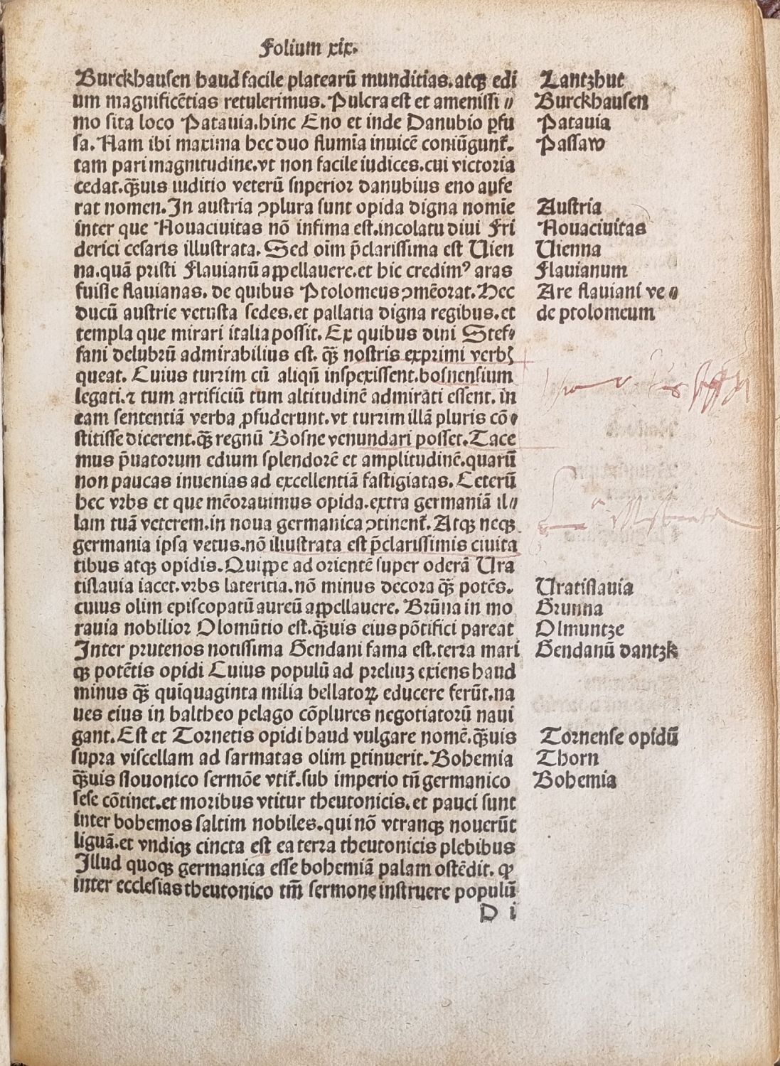 ISTC Ip00744000; BMC III, str. 40; Goff P744, HC 249, Šimáková-Vrchotka č. 1579<br>Tištěno bastardou, 39 řádků, tištěné poznámky po stranách, signatury, nepaginováno, od folia B6 neživá záhlaví, poslední folio nepotištěné. Imresum na rubu folia H7 "Finit Enee siluij seu Pape Pij. de Ritu. Situ Moribus. ac Conditione almanie opus celeber=rimum, ..... per Baccalariu(m) wolfgangum Stockel de Monaco. Opidanu[m] Lyptzick impressum. et bene emendatum. Anno a natiuitate cristi Millesimo quardringe[n]tesimonogesimeocto. Di vero nona Mensis aprilis (9.4. 1496)". - Dílo je druhým přívazkem níže posaných prací.<br>První dílo ve svazku - Plinius "Quae in isto continentur opusculo. C. Plinii iunioris epistolae per Philippum beroaldu[m] emendatae" & unus est adiunctus liber: qui in aliis sup i[m]pressis minime co[n]tinebatur. Etia[m] eiusdem auctoris panegaerycus in laudem Trayani imperatoris: & de iuris illustribus libellus". Venetiis, Albertus Vercellius, 20. Aprilis 1501, 102 nepaginovaných listů (a8-k8,l10,m8,n4 - na foliu b2 chybně uvedeno b3). Tištěno antikvou, impresum v kolofonu, tučně tištěné versálky ve výši 2-3 řádků, neživá záhlaví s vyznačením jednotlivých částí knihy, v úvodu jednotlivých knih (devíti) konturové iniciály v jednoduchém rámečku na ilustrativním pozadí zalomené do výše 6 řádků. Za devátou knihou na foliu i5 "C. PLINII SECVNDI NOVOCOMENSIS PANAEGIRICVS TRAIANO AVGUSTO DICTVS".<br> + 1. přívazek: Beda svatý; Publius, Victor "Venerabilis Bedae presbyteribus siue de sex aetatibus huius seculi Liber Incipit. P. Victoris De Regionibus Urbis Rome Libellus Aureus. Cum priuilegio". Venetia, Ioan. de Tridino alias Tacuino, 28. Mai 1505, 50 listů (A4-L4,M6), tištěno antikvou, tištěné rubriky a poznámky po stranách, tři konturové iniciály v jednoduchém rámečku na pozadí z rostlinných ornamentů zalomené do výše 4 řádků, konturová iniciála v jednoduchém rámečku s vyobrazením dvou nahých chlapců a psa zalomená do výše 9 řádků. Impresum v kolofonu, v úvodu předmluva Petruse Mar.(enuse) Aleandera datovaná v Patávii (Padově) I.4. 1505.<br>Pozdně renesanční vazba, dřevěné desky potažené tmavě hnědou hovězinou, na obou deskách tlačený dvojitý rám zdobený rostlinným ornamentem, uvnitř rámu menší rám ze čtyř linek vyplněný rostlinným ornamentem. Vazba místy odřená, při okrajích restaurovaná, rostlinný ornament zčásti setřený, při horním okraji přední desky u hřbetu v délce 4,5 cm naprasklá, na zadní desce na několika místech proděravělá od červotoče a při vnějším okraji chybí kousek koženého pokryvu. Na předním přídeští nalepeno ex libris s rakouskou orlicí. Na přední předsádce vlastnický přípis "Luigi di Campi" a perem napsaný obsah svazku. Na tit. listu prvního díla jiný vlastnický přípis perem "Sum ex Bibliotheca Mathiae ?". Místy zahnědlý papír a světle hnědé skvrny způsobené vlhkostí. U druhého přívazku (Pia II.) mezi folii G6 a H1 vevázána makulatura z gotického rukopisu.