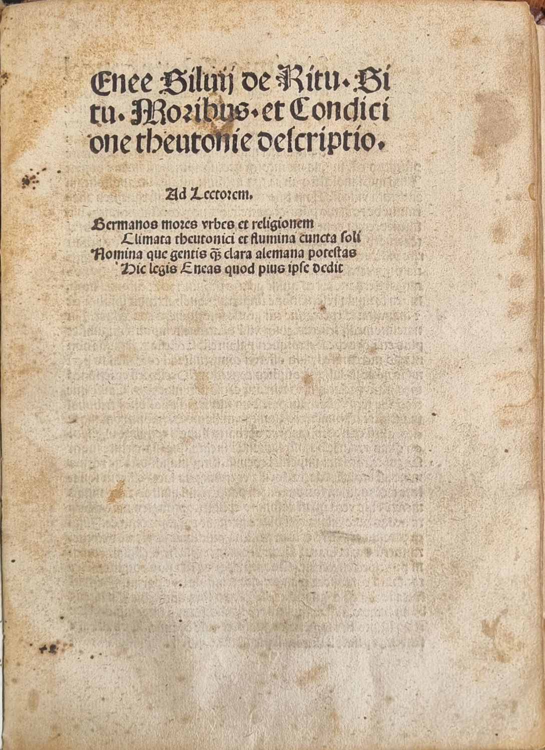 Enee Siluji de Ritu. Situ. Moribus. et Condicione theutonie descriptio. Ad Lectorem. Germanos mores vrbes et religionem Climata theutonici et flumina cuncta soli Aomina que gentis s. clara alemana potestas Hic legis Eneas quod pius ipse dedit.