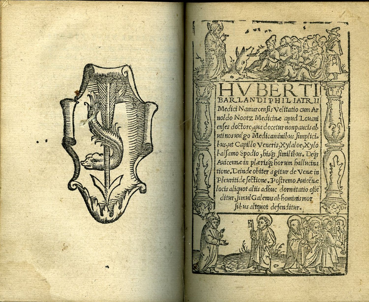+ přívazek: Barlandus, Hubertus: Velitatio cum Arnoldo Nootz Medicinae apud Louanienses doctore, qua docetur non paucis ab uti nos vulgo Medicaminibus simplicibus, ut Capillo Veneris, Xylaloe, Xylobalsamo Spodio, hisq[ue] similibus. Deq[ue] Avicennae in plaerisq[ue] horum hallucinatione. Deinde obiter agitur de Venae in Pleuritide sectione. Postremo Avicen[n]ae locis aliquot aliis adhuc dormitatio oste[n]ditur, simul Galenus ab hominis morsibus aliquot defenditur. (Antverpiae, ex aedibus Henrici Petri Middelbur, 1532), (100) fol., tit. list s figurální dřevořez. bordurou; na cca 10 posledních listů s hnědými skvrnkami od vody. - První vydání vzácného spisu nizozemského lékaře Huberta Barlanda (Hubert van Baerland, 1510-1550), jenž pocházel z vesnice Barland v provincii Seeland, činný byl v Namuru, přátelil se též s Erasmem Rotterdamským. Kromě několika málo spisů napsal předmluvu k lyonskému vydání Dioscorida a přeložil Galenovu knihu "De remediis paratu facilibus" z řečtiny do latiny. - Durling 59,471; Adams ani VD 16 neuvádí<br>