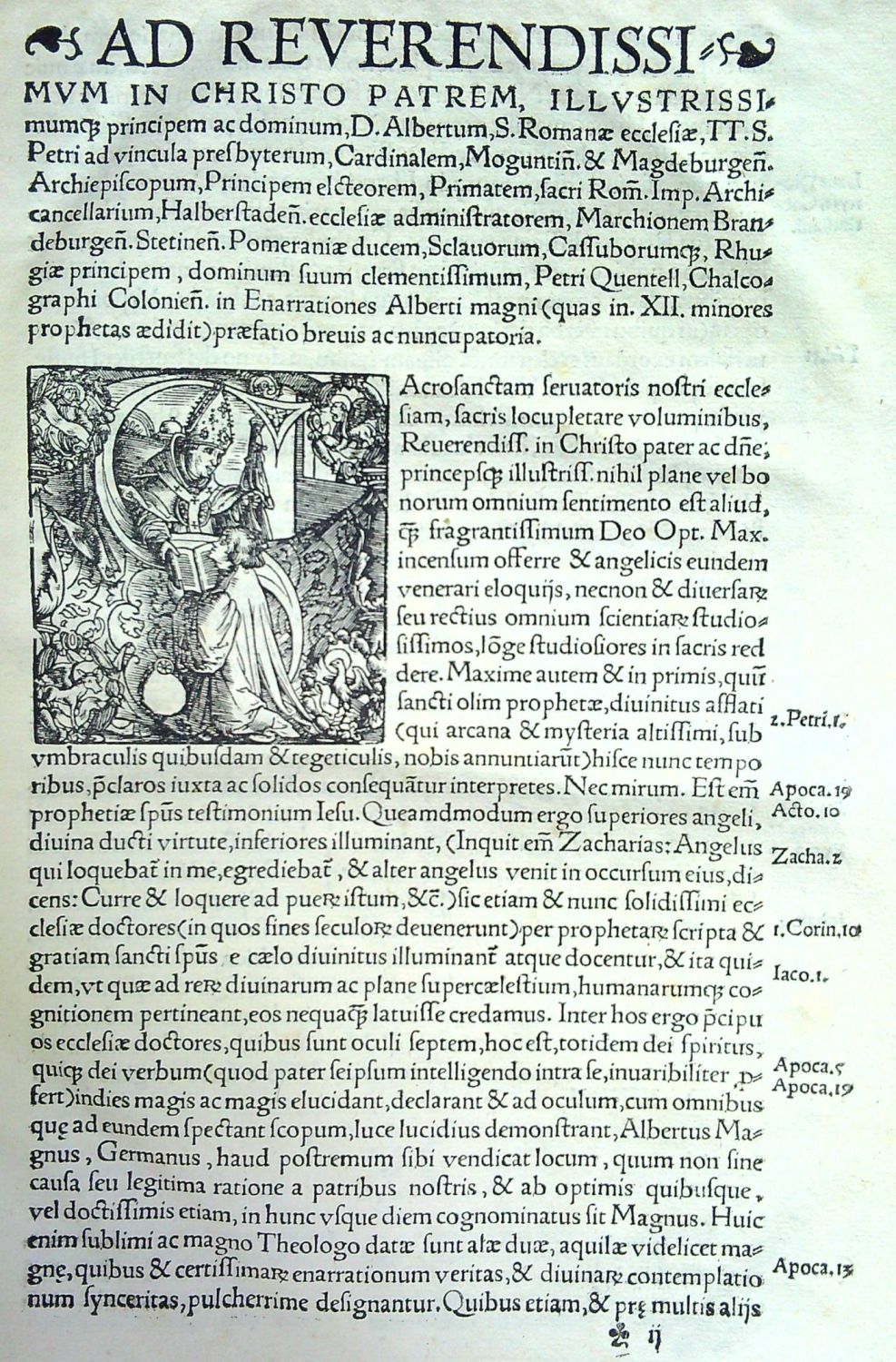 | Ilustrace: | Titulní list v dřevořezové borduře od Antona Woensama, v horní části bordury portrét Alberta Velikého s biskupskou mitrou na hlavě a berlou v ruce, kterému vzdávají hold světská knížata, na líci dedikačního listu konturová iniciála v jednoduchém rámečku ve výši 13 řádků se zakomponovaným portrétem Alberta. V textu řada Woensamových dřevořezových konturových iniciál ve výši 6-10 řádků na ilustrativním pozadí. |