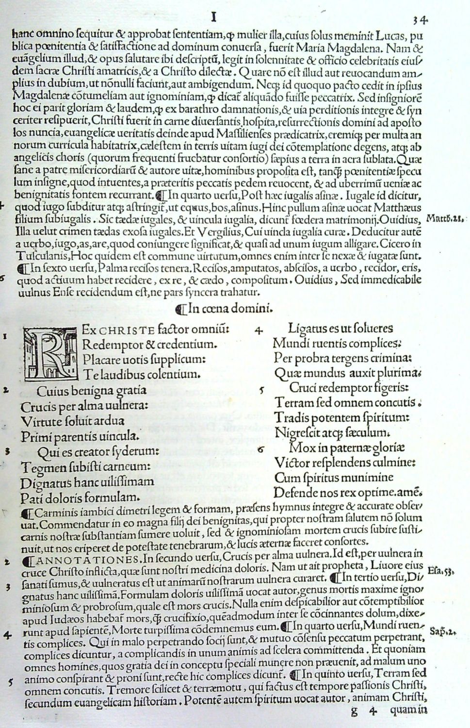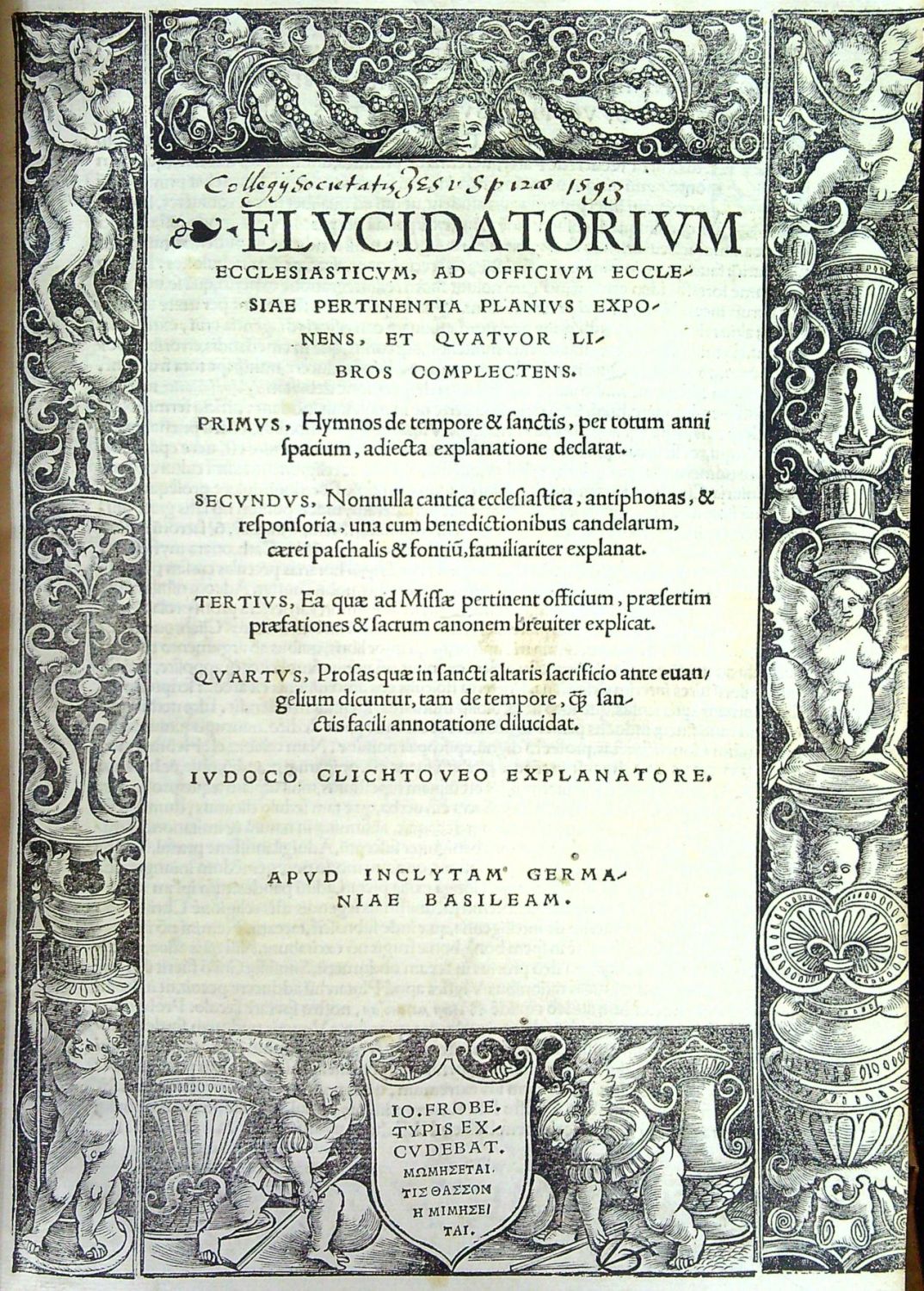 VD 16 A,1340; Adams I, 546<br>Živá, versálkami tištěná záhlaví, tištěné poznámky po stranách, impresum v kolofonu. Na rubu titulního listu tištěná poznámka o Albertu Velikém z pera Johanna Trithemia.<br>Albertus Magnus čili Albert Veliký (po roce 1200 - 15.11.1280 Kolín nad Rýnem), jeden z nejvýznamnějších středověkých učenců, nejdůležitější představitel německé scholastiky. Krom teologie se zabýval filosofií a studiem přírodních věd. Pro svoji všestrannost byl nazýván "doctor universalis", mimo jiné byl učitelem Tomáše Akvinského. Věřil v transmutaci, ale na rozdíl od alchymistů se domníval, že ji není možno pro velkou složitost provést. Ve svém díle "De minerabilus" popsal výrobu rtuti z rumělky a oddělení stříbra od olova oxidačním tavením jejich slitin, výrobu arsenu z rud aj.<br>Anton Woensam (krátce před rokem 1500 ve Wormsu - 1541 Kolín nad Rýnem), významný renesanční dřevorytec a autor řady předloh pro knižní dřevořez. Od roku 1523 působil v Kolíně nad Rýnem, kde pracoval především pro nakladatele Petra Quentella a Eucharia Cervicornuse.<br>Johannes Trithemius (1.2.1462 Trittenheim - 13.12.1516 Würzburg), významný německý učenec a humanista, byl opatem kláštera ve Sponheimu, kde vytvořil jednu z největších a nejpozoruhodnějších knihoven své doby. Po konfliktu se svými mnichy, kteří část knihovny spálili, Sponheim v roce 1505 opustil.<br> + přívazek:<br>Clichtove, Josse: ELUCIDATORIUM ECCLESIASTICUM, AD OFFICIUM ECCLESIAE PERTINENTIA PLANIUS EXPONENS, ET QUATOR LIBROS COMPLECTENS. PRIMUS, Hymnos de tempore & sanctis, per totum anni spacium, adiecta explanatione declarat. SECUNDUS, Nonnulla cantica ecclesiastica, antiphonas, & responsorial, una cum benedictionibus candelarum, caerei paschalis & fontiu, familiariter explanat. TERTIUS, Ea quae ad Missae pertinent officium, praesertim praefationes & sacrum canonem Breuiter explicat. QUARTUS, Profas quae in sancti altaris sacrificio ante evangelium dicuntur, tam de tempore, cum sanctis facili annotatione dilucidat. Basel, Johann Froben, 1517, [VI]-229-[1] listů. Titulní list v dřevořezové borduře od Urse Grafa (signováno jeho iniciálami ve spodní desce vpravo dole), v textu řada dřevořezových konturových iniciál na ilustrativním pozadí zalomených do výše 4-5 řádků, dvě iniciály s putti zalomené do výše 9 řádků, tištěné poznámky po stranách, rubriky, na líci posledního listu Frobeniův do dřeva řezaný signet, impresum v kolofonu. Na rubu titulního listu tištěné dedikační psaní Wolfganga Fabricia Capita, datované 3. srpna 1517 v Basileji, reformovanému basilejskému biskupovi Christophu von Utenheim.<br>D 16, C4193<br>Josse Clichtove, latinským jménem Judocus Clichtoveus (1472/73 Nieuwpoort - 22.9.1543 Chartres), vlámský katolický kontroversní teolog, reformátor a humanista. Nabízená práce je druhým vydáním, které bylo doplněno dopisem biskupovi Utenheimovi (první vydání vyšlo roku 1516 v Paříži). <br>Wolfgang Fabricius Capito (1478 Haguenau - 4.11.1541 Štrasburk), německý protestantský teolog a reformátor, přítel Melanchtona a vůdčí osobnost reformace ve Štrasburku, udržoval též kontakty s Joselem Gerschomem z Rosenheimu a byl též autorem učebnice hebrejské gramatiky.<br>Christoph von Utenheim (cca 1450 - 16.3.1527 Pruntrut) vystudoval teologii a kanonické právo, roku 1473 byl zvolen rektorem basilejské university, od roku 1502 biskupem basilejské diecéze. Pokoušel se o reformu v rámci katolické církve a roku 1503 svolal do Basileje církevní synod. Ve svém úsilí neuspěl a roku 1527 na svůj post rezignoval a odešel do Pruntrutu, kde krátce poté zemřel.<br>Urs Graf (cca 1485 Solothurn - 13.10.1528) byl švýcarský zlatník, grafik a tiskař. Proslul především jako autor dřevorytů a vynálezce techniky bílé čáry v dřevorytu, kdy bílé čáry vytvářejí obraz na černém pozadí.<br>