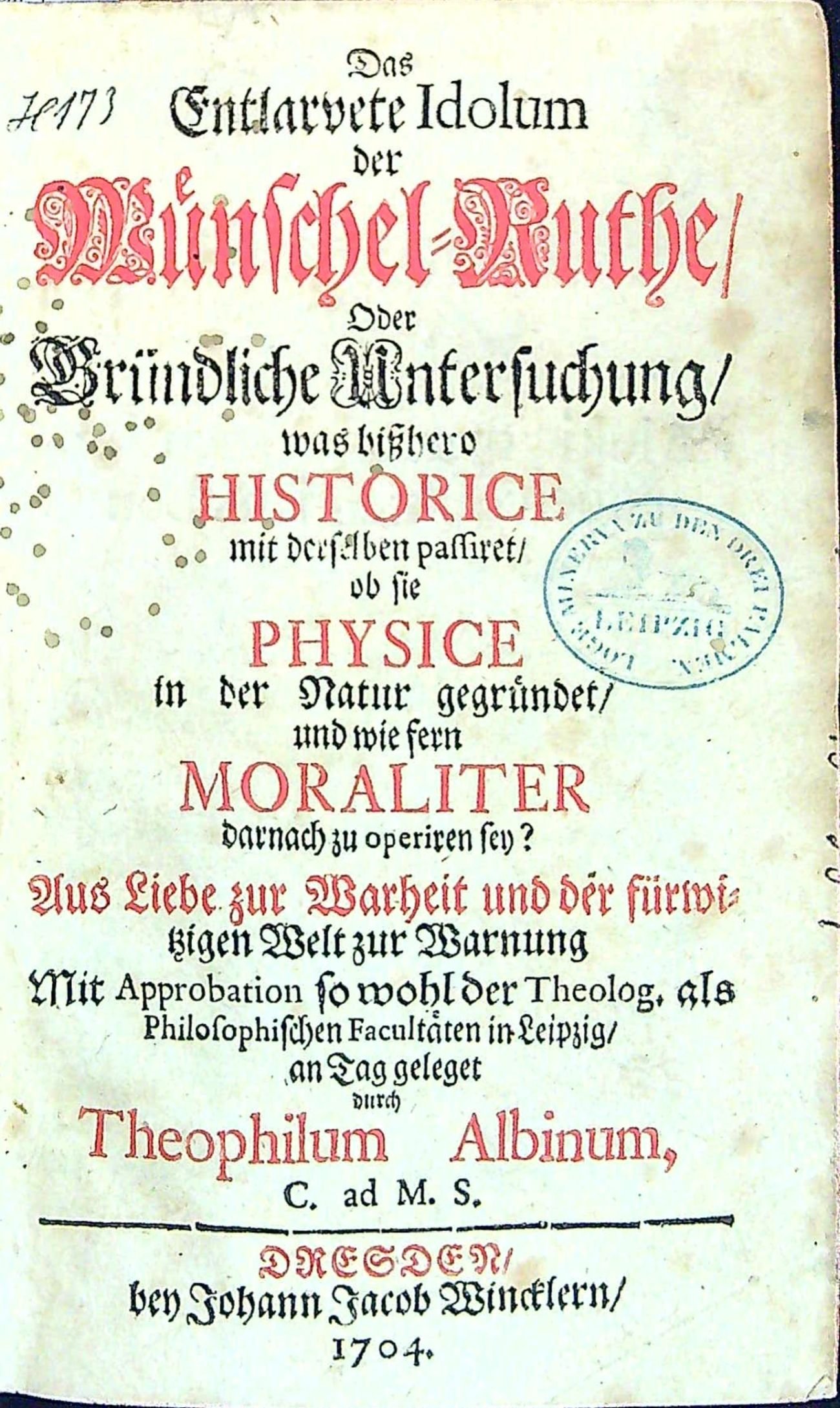 Das Entlarvete Idolum der Münschel=Ruthe/ Oder Gründliche Untersuchung, was bisshero HISTORICE mit derselben passiret/ ob sie PHYSICE in der Natur gegründet/ und wie fern MORALITER darnach zu operiren seyn? Aus Liebe zur Warheit und der fürmitzigen Welt zur Warnung Mit Approbation so wohl der Theolog. als Philosophischen Facultäten in Leipzig/ an Tag geleget durch Theophilum Albinum, C. ad M. S.n