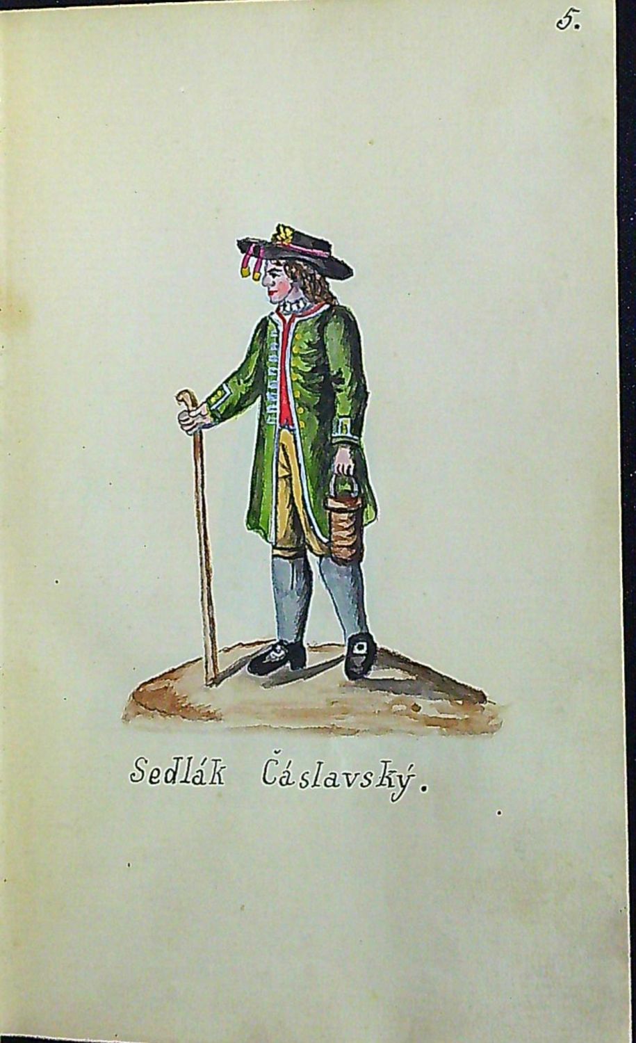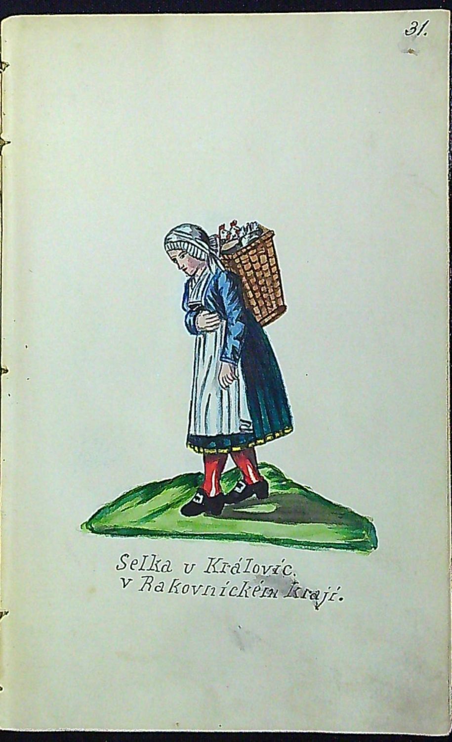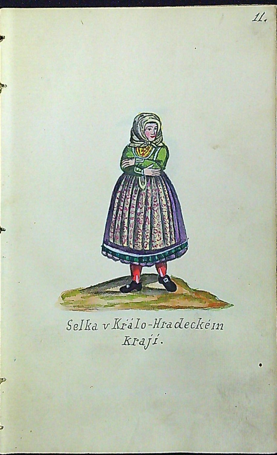 V albu je celkem 64 vyobrazení s kroji sedláků a selek z různých krajů Čech (Bydžov, Budějovice, Krumlov, Mladá Boleslav, Čáslav, Cheb, Loket, Jáchymov, Klatovy, Domažlice, Hradec Králové, Náchod, Litoměřice, Rumburk, Rudohoří, Plzeň, Prácheňsko, Most, Jindřichův Hradec, Pelhřimov, Rakovník, Chrudim, Beroun, Benešov, Kouřim, Roudnice, Vrchlabí, Šandava, Jablonné v Podještědí, Landškroun, Kralovice, Podbořany). Kresby malované akvarelem na líci jednotlivých listů, pod nimi kaligraficky perem napsané místo. Při horním vnějším okraji stran arabská paginace (listy s mužským a ženským krojem ze stejné oblasti paginovány stejným číslem).<br>Plátěná vazba od B. Raimanna z 80. let 19. století, desky potažené černým plátnem, ve hřbetu světle červeným. Na přední předsádce staré razítko "B. Raimann a syn v Náchodě. Sklad veškerého psacího a kreslícího náčiní, hojný výběr zboží galanterního, též i modlitebních, učebných, zábavných kněh. KNIHAŘSTVÍ". Naražené rohy, vazba lehce ohmataná.