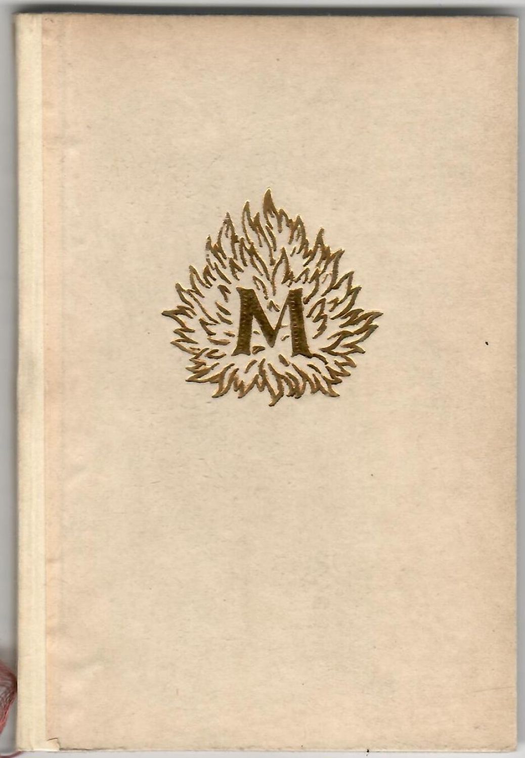 T. F. Šimon též knihu typograficky upravil, navrhl barevné předsádky a vazbu, kterou provedl Antonín Malík. Tištěno písmem Bernhard antikva v Grafii, dvoubarevný tisk. - Ex. č. 384/730, tento výtisk tištěný na pravý japan. Frontispis uvolněný z vazby, pouzdro mírně natržené, jinak dobrý stav.