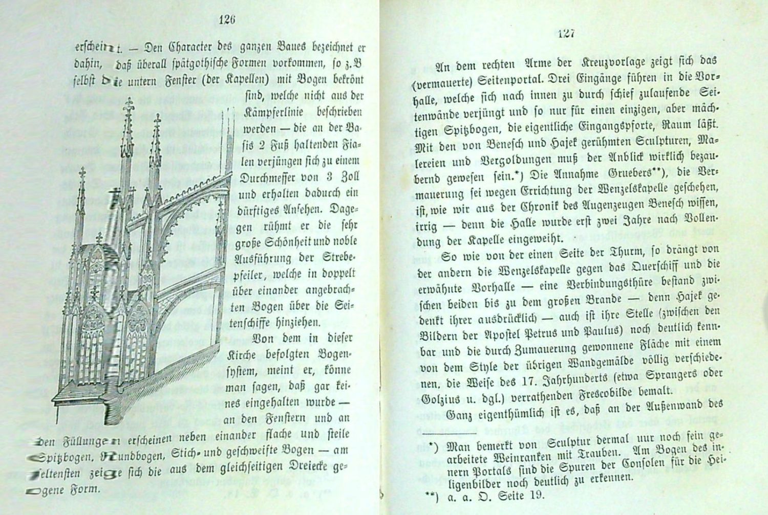 Hnědý plátěný hřbet se zlac. věcným názvem, na obou deskách litograf. ilustrace, torso pův. přebalu (pokryv hřbetu chybí); na okrajích listů místy hnědé skvrnky, na tit. listu staré vlastnické razítko "Vincenz Lang Commandeur". - Podrobný popis svatovítské katedrály z pera hudebního skladatele Viléma Augusta Ambrose (1816 Mýto - 1876 Vídeň). Od r. 1869 byl profesorem hudby na pražské univerzitě a profesorem dějin na konzervatoři (díky jeho nepříznivému zdání se nestal B. Smetana ředitelem pražské konzervatoře) a počínaje r. 1872 působil ve Vídni, kde přispíval jako kritik do různých hudebních časopisů, mimo jiné i do Schumannovy "Neue Zeischrift für Musik". Jeho nejvýznamnějším dílem jsou nedokončené "Geschichte der Musik".
