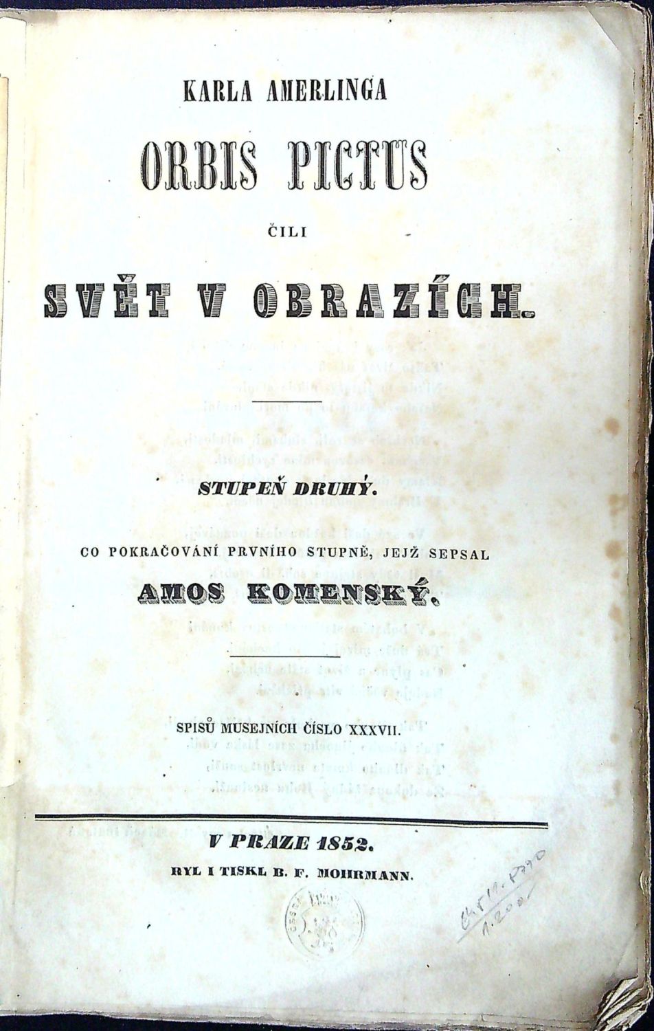 Kniha vyšla jako XXXVII. díl spisů musejních. Tištěno antikvou. V textu několik světle hnědých map. Na tit. listu při spodním okraji uprostřed suché razítko "Časká matice". - Původní pap. obálka při okrajích pomačkaná a při spodním okraji hřbetu natržená, oslí uši.<br>Karel Slavoj Amerling alias Strnad Klatovský (*1807 v Klatovech, †1884 v Praze), svérázný filozof, pedagog, lékař, cestovatel, správce přírodovědeckých sbírek, puristický tvůrce českého názvosloví, iniciátor překladů světové literatury do češtiny, psychiatr a ředitel ústavu choromyslných... V šestadvaceti letech se Amerling stal asistentem univerzitního profesora J. S. Presla, který usiloval o přirozenost a srozumitelnost odborného přírodovědeckého jazyka, přičemž si českou terminologii někdy vymýšlel, jindy přejímal z ruštiny či překládal z němčiny. Amerling se stal jeho celoživotním stoupencem a jeho terminologii si ve svém díle dále dotvářel. Kolem Amerlingova výchovného ústavu Budeč se shromažďovali význační vlastenci. Byla to jedna z prvních institucí zaměřených na výchovu dívek, s budečskými ženami se stýkala Božena Němcová, jednou z vůdčích osobností této školy byla Antonie Raissová, pozdější manželka F. L. Čelakovského.