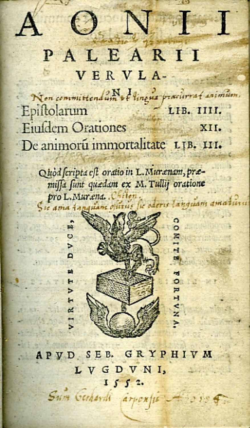 Sybille von Gültlingen V,1240-1241; Baudrier VIII,257-258<br>Na titulních listech tiskařův signet, konturové iniciály na ilustrativním pozadí s lidskými postavami a zvířaty zalomené do výše 6-9 řádků, v úvodu jednotlivých kapitol iniciály v jednoduchém rámečku na rostlinném, částečně ilustrativním pozadí zalomené do výše 4 řádků, tučně tištěné versálky ve výši 2 řádků, živá záhlaví, řecká text alfabetou, na straně 211 mezititul (Orationes), třetí část (De animoru) samostatně paginovaná a opatřená vlastním titulním listem, na konci varianta tiskařova signetu s vyobrazením gryfa. - Vazba z temně hnědé hověziny z počátku 21. století od významného knihvazače a restaurátora Tomáše Vyskočila. Na přední i zadní desce je zakomponován do vazby zbytek původního pokryvu, rám z ornamentů. Ve hřbetu 5 vazů, ručně šitý kapitálek, strana 45 v prvé části je vevázána za str. 48. Knižní blok při horním okraji oříznutý po živé záhlaví, papír odkyselený. Na titulním listu rkp. marginálie a provenienční přípis jednoho z předchozích majitelů knihy (Gerhard Carpons), v textu místy podtrháváno a na několika místech po stranách rkp. marginálie. - Aonian či Antonius Palearius Verulanus (1503 Veroli - 1570 Řím), byl italský lékař a filosof, humanista. Profesor na universitě v Sieně.
