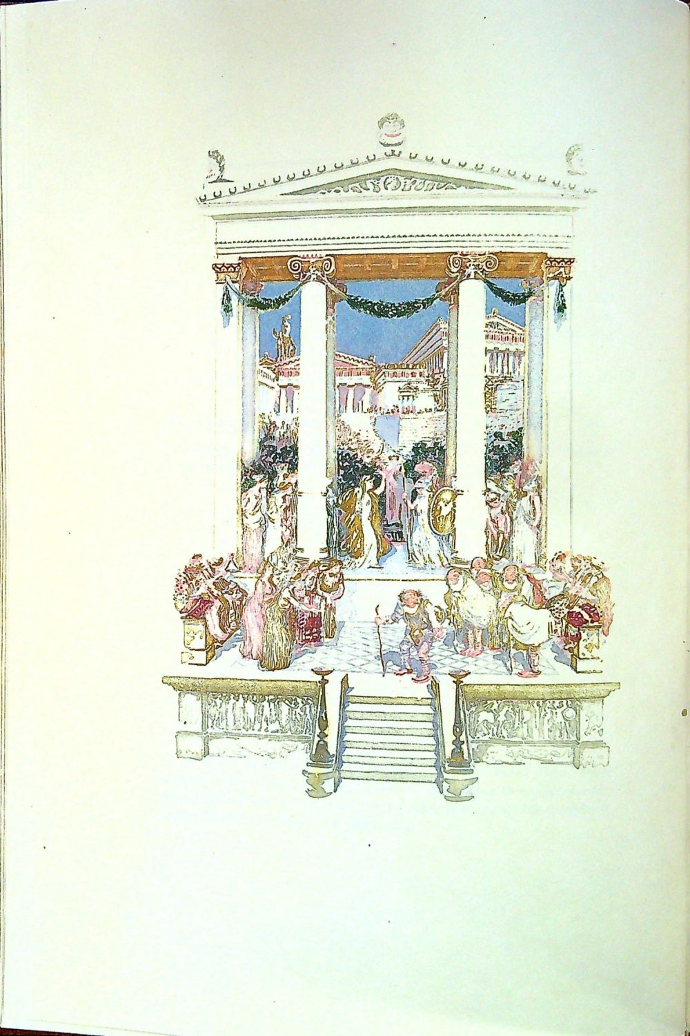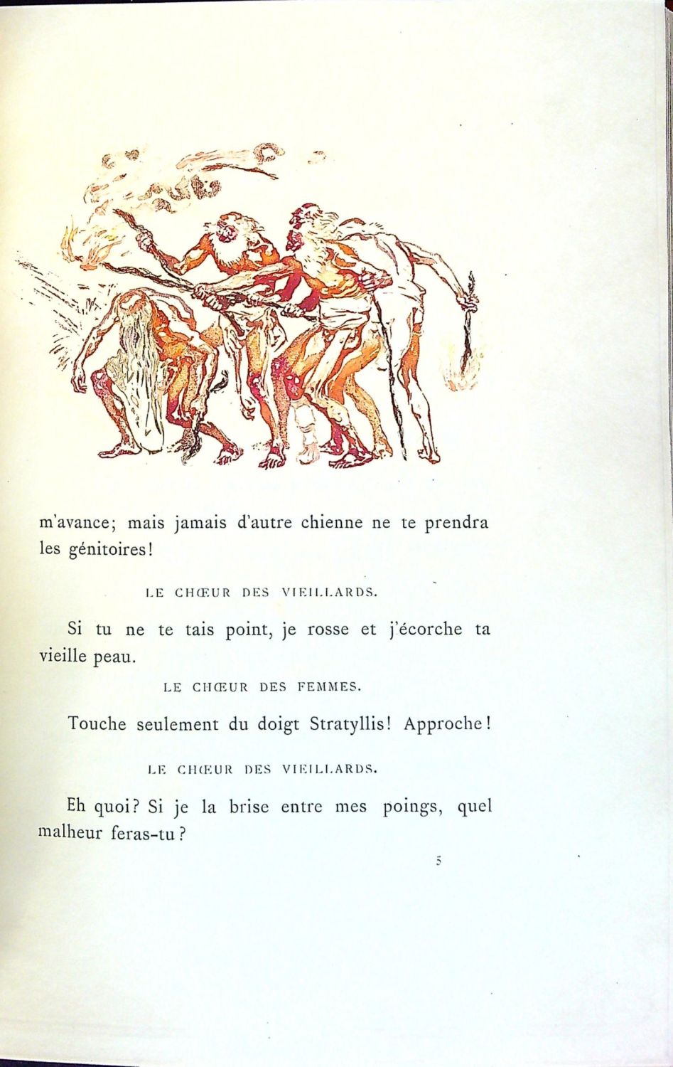 | Ilustrace: | František Kupka - v textu 19 barevných leptů o rozměru cca 85 x 125 mm, frontispis (180 x 125 mm, barevný lept), za tiráží 43 příloh s lepty (ilustracemi v textu) ve dvou stavech (krom front., který je ve 4 stavech, a 4. ilustrace, která je ve stavech třech). Většina přivázaných leptů je s vinětou (většinou barevnou), která na leptech v textu není. Poslední list je s leptem 1. ilustrace (s vyobrazením Lysistraty) a na jeho rubu tištěné oznámení o připravované bibliofilii "Prométheus" s Kupkovými lepty. |