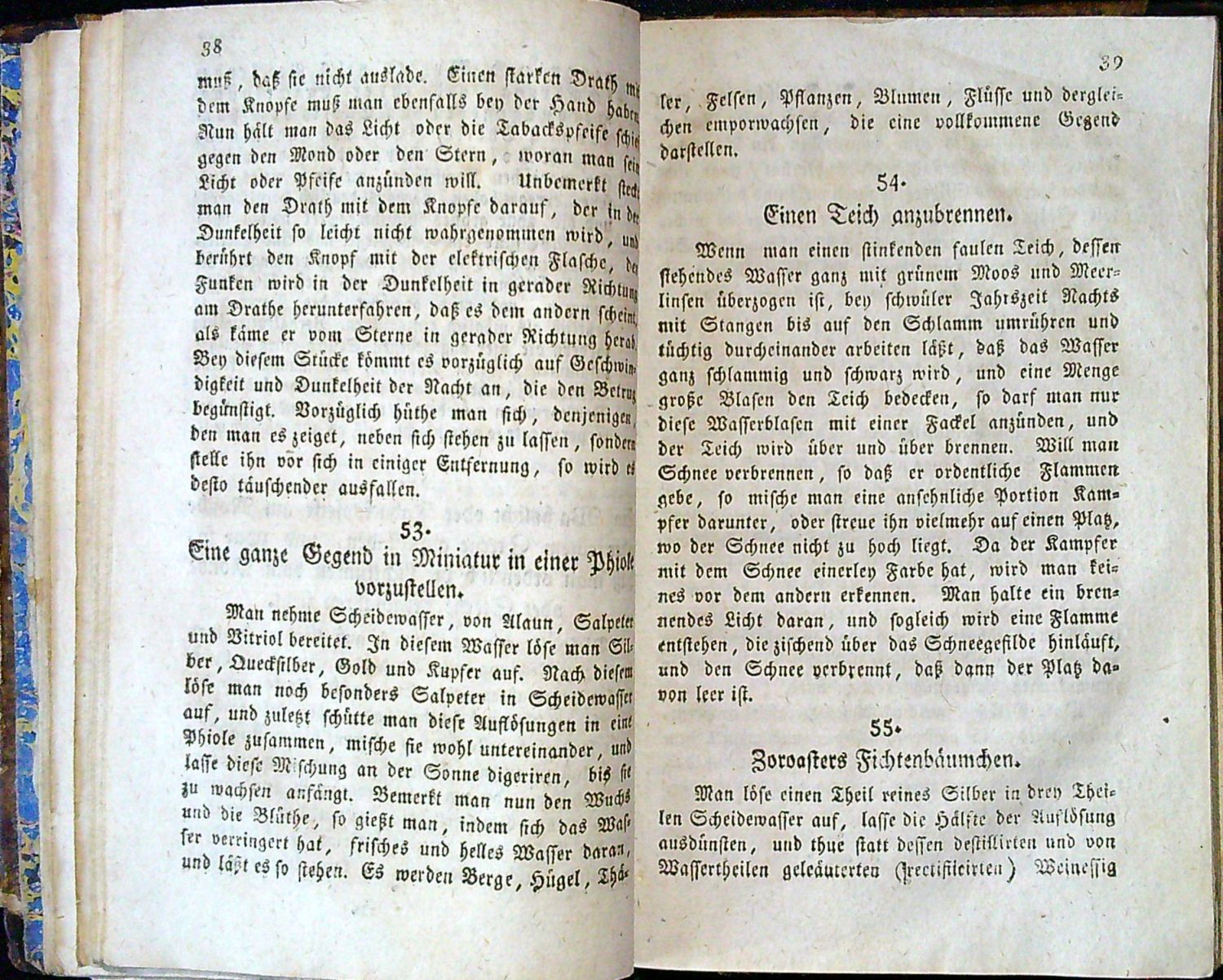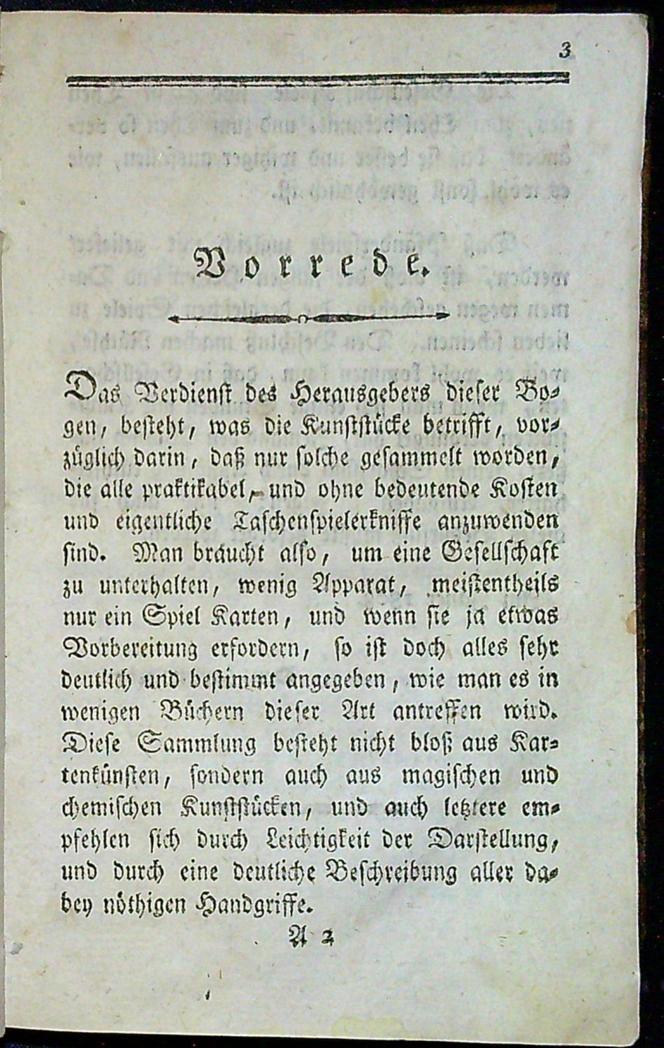 Tištěno švabachem, v úvodu předmluva vydavatelova datovaná leden 1808. Kniha obsahuje 155 popsaných kouzel a triků, které vydavatel čerpal z uvedených autorů. <br>Dobová kartonová vazba s deskami potaženými mramorovaným papírem, kožený hřbet a nárožnice, ve hřbetu jednotlivá pole dělená pásem z drobných ornamentů, ve druhém poli původní vínově červený kožený štítek s tlačeným a zlaceným názvem, ve čtvrtém poli zelený kožený štítek se stylizovaným tlačeným a zlaceným vyznačením dílu (1), v horním a spodním poli tlačené ozdůbky. Vazba ohmataná a zašpiněná, pap. pokryv místy lehce zkrabatělý, ve hřbetu v 5. poli kůže proděravělá. Na předsádkách a přídeštích dobový mramorovaný papír. Na několika listech oslí uši. - Pravděpodobně první díl ze tří celkem vydaných velmi vzácného vydání, které dle worldcat katalogu není kompletní v žádné světové knihovně. (Pouze jeden díl v polské Národní knihovně a jeden díl v americké Kongresové knihovně. <br>Jacob Philadelphia (14.8. 1735 Philadelphia - zemřel po roce 1795), vlastním jménem Jakob Meyer, americký kouzelník, od roku 1757 pobýval v Evropě (Anglii, Portugalsku, na dvoře Kateřiny II. v Petrohradu, v Německu, u Mustafy III. v Konstantinopoli). <br>Theodor Ferdinand Kajetan Arnold (4.4. 1774 Erfurt - 13.10. 1812 Erfurt), německý právník, spisovatel a varhaník. Publikoval též pod pseudonymy Agrippa von Nettesheim či Enslin jüngere. <br>Giovanni Giuseppe Pinetti (1750 v Toskánsku - cca 1803 pravděpodobně v Berdičevu na Ukrajině), profesor přírodní magie, na konci 18. století jeden z nejslavnějších kouzelníků své doby, stál také u zrodu reklamy na divadlo.