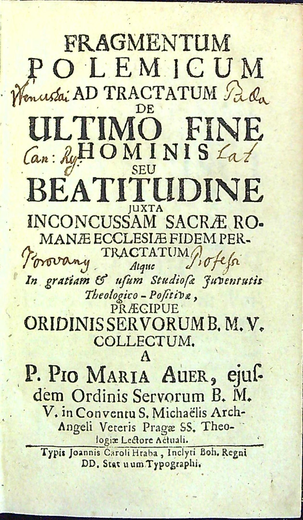 FRAGMENTUM POLEMICUM AD TRACTATUM DE ULTIMO FINE HOMINIS SEU BEATITUDINE JUXTA INCONCUSSAM SACRAE ROMANAE ECCLESIAE FIDEM PER TRACTATUM Atque In gratiam et usum Studiosa Juventutis Theologico-Positiva, PRAECIPUE ORIDINIS SERVORUM b.m.v. COLLESTUM. A P. PIO MARIA AUER, ejusdem Ordinis Servorum B.M.V. in Conventu S. Michaëlis Arch-Angeli Veteris Pragae SS. Theologiae Lectore Actuali.