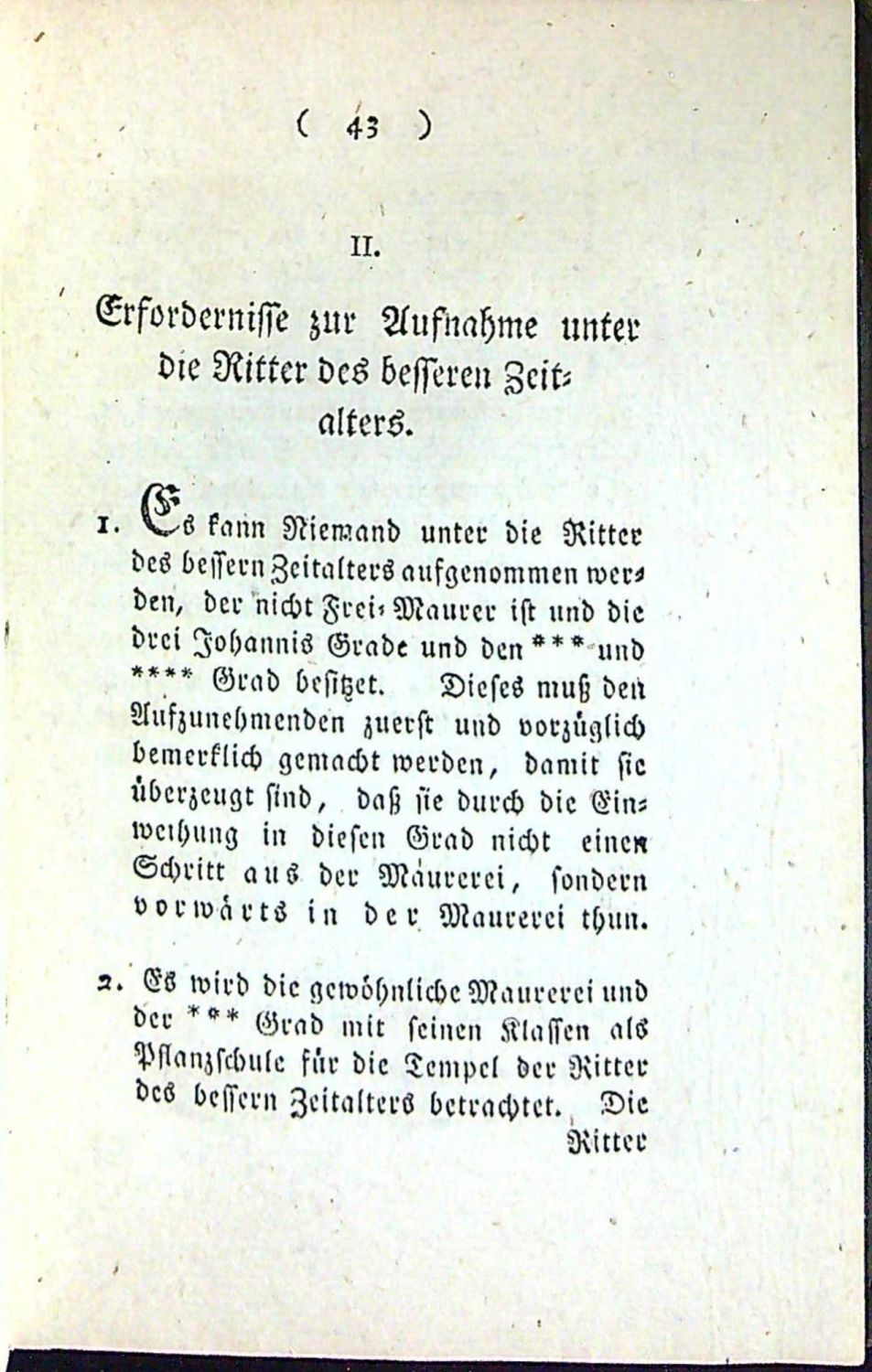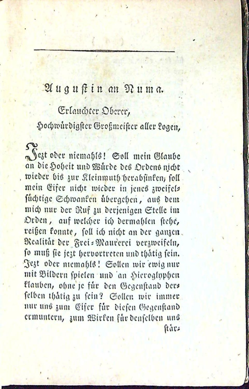 Wolfstieg 2031<br>Tištěno švabachem. V prvé části knihy korespondence mezi mladým a horlivým zednářem Augustinem a velmistrem všech lóží o účelu o konečném cíli svobodných zednářů. Od strany 40 kapitolky o ústavě, rituálu, katechismu, stavbě chrámu pro rytíře lepšího věku a jejich oblečení, ....<br>Dobová kartonová vazba, při horním okraji hřbetu dobový kožený štítek s tlačeným názvem, barvená svrchní ořízka. Vazba ohmataná a místy odřená, kožený štítek při okraji přední desky odtržený, na rubu přední předsádky tužkou anglický přepis titulního listu, při vnějším horním okraji tit. listu staré razítko neurčené zednářské lóže "K.M:".