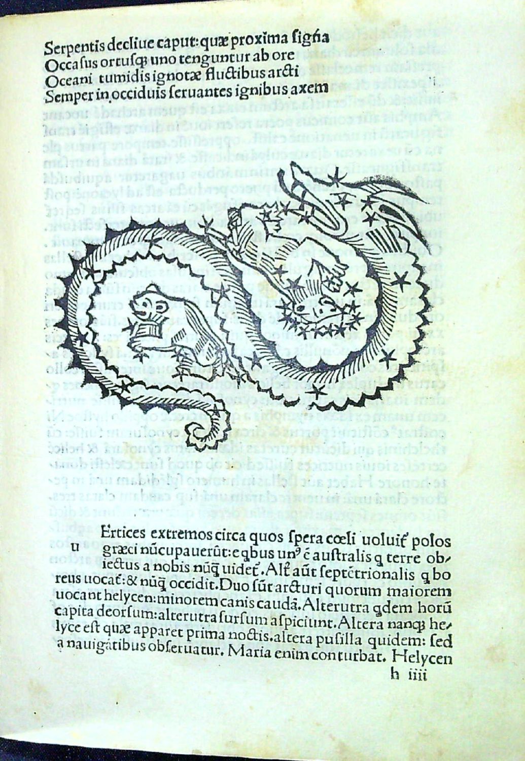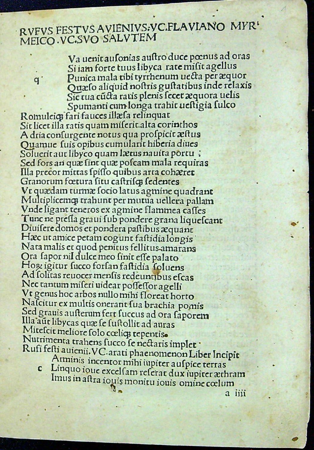 ISTC ia01432000; BMC V,294; GOFF A1432; HC 2224; GW 3131<br>Tisk antikvou ve 38 řádcích, nadpisy tištěné versálkami, vynechaná místa pro iniciály s předtištěnou reprezentantou pro rubrikátora. Nepaginováno (a10, b-p8 - folia a1, g8, p7-8 nepotištěná). V části Phaenomena v textu 38 dřevořezových ilustrací (na foliu H2a zvěrokruh, na dalších stranách alegorická vyobrazení zvířetníkových a jiných souhvězdí), které jsou zčásti stranově obrácenými kopiemi dřevořezů Thomase de Blavise, které vyšly poprvé v Benátkách u Ratdolta jako doprovod ke knize "Poetica astronomica" od Hyginuse v Benátkách roku 1485.<br> Kniha se skládá z několika částí: na foliu a2-3 dopis editora knihy Viktora Pisana Paulu Pisanovi, na foliu a4a-d3b Arati "Phaenomena" (v překladu Araviana), na foliu d3b-f6a Dionysius "Descriptio orbis terrae" (De situ orbis), na foliu f6a-g7a Avienus "Ora maritima", na foliu h1a-m8a Arati "Phaenomena" (v překladu Germanica), na foliu m8b-n6b Arati "Phaenomena" (v překladu Cicerona), na foliu n7a Quintus Serenus "Medicinae liber", na foliu p6a kolofon, na foliu p6b dopis Victora Pisana Paulovi Pisanovi.<br>Pergamenová vazba (194 x 145 mm, knižní blok 192 x 140) z konce 17. století. Chybí nepotištěná folia a1, p7-8, chybící folia a2,a3,p1,p2 jsou nahrazeny vevázanými faksimilemi pořízenými z exempláře Knihovny pražských premonstrátů, folio b1 ve spodní části utržené (cca 73 x 80 mm) a chybící část nově dolitá. Na několika listech při vnějším okraji hnědé skvrny způsobené vlhkostí, folia o3-o6 se světle hnědými mapami od vlhkosti.<br>Postumius Rufius Festus Avienus (4. století občanského letopočtu) latinský spisovatel a básník, překladatel z řečtiny. Jeho překlad Aratovy didaktické básně je nepřesný a překlad Dionýsova spisu, který v řeckém originále byl napsán v hexametrech stručným a elegantním stylem je přeložen do poněkud archaizující latiny.<br>Arátos či Aratos (315 až 240 před naším letopočtem), starořecký básník. Ve své didaktické epické skladbě "Fainomena" (Phaenomena, Nebeské jevy) shrnuje dobové astronomické vědění, v prvé zčásti dochované části popisuje stálice, planety a souhvězdí, v části druhé je výklad o předpovídání počasí. Popis hvězdné oblohy je střídmě protkán bájemi o vzniku hvězd. Dílo mělo velký ohlas a proto bylo již ve své době přeloženo třikrát do latinského jazyka (Cicero, Germanicus a Avienus).<br>Dionysius Periegetes, pocházel pravděpodobně z Alexandrie a žil v době císaře Hadriána v první polovině 2. století (někteří badatelé datují jeho život až na konec 3. století), jeho kniha "Descriptio orbis terrae" (Popis zemí světa) se těšila velké oblibě a již v dávných dobách sloužila jako školní učebnice. <br>Quintus Serenus Sammonicus (zemřel roku 212) byl římský učenec a učitel Gety a Caracally (některými badateli zřejmě mylně ztotožňovaný s významným lékařem, kterého nechal během hostiny zavraždit císař Caracalla). Jeho nejznámějším dílem je didaktická báseň "Liber medicinalis" (Lékařská kniha), která obsahuje řadu popisů různých léků, jedů a též řadu magických formulí, mimo jiné slavné abrakadabra.