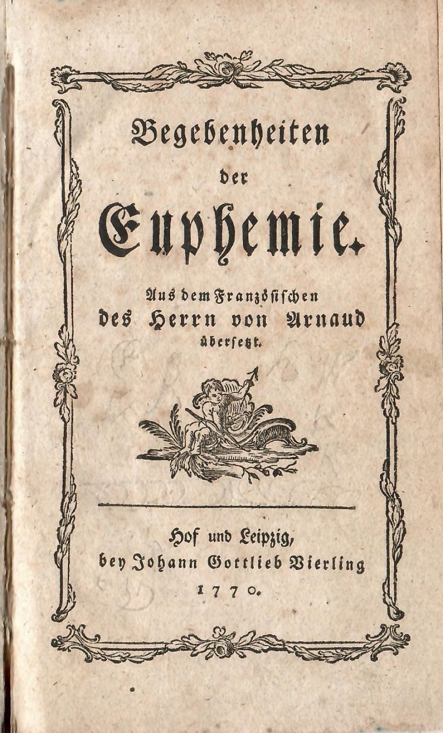 Tištěno švabachem, neživá záhlaví, titulní list olemovaný rámečkem s rostlinou kompozicí, na tit. listu viněta, koncová viněta, vstupní pásový vlys a tučně tištěná versálka z jedné strany olemovaná rostlinou ilustrací. - Dobová kartonová vazba potažená tragantovým papírem, vazba lehce ohmataná, papír místy zahnědlý.<br>Francois-Thomas-Marie de Baculard d´Arnaud (15.9. 1718 Paříž - 8. či 9.11. 1805 Paříž), prozaik, básník a dramatik. Vzbudil zájem Voltaira, který ho podporoval radami a podpořil stipendiem, pruský král Fridrich II. ho pozval do Berlína ke svému dvoru, kde se stal členem Královské akademie věd, roku 1751 se stal poradcem francouzského velvyslanectví v Drážďanech, poté se vrátil do Paříže a věnoval se nadále pouze literatuře. Psal v duchu "temného žánru" a série jeho novel inspirovala Belliniho k napsání opery "Adelson a Salvini".
