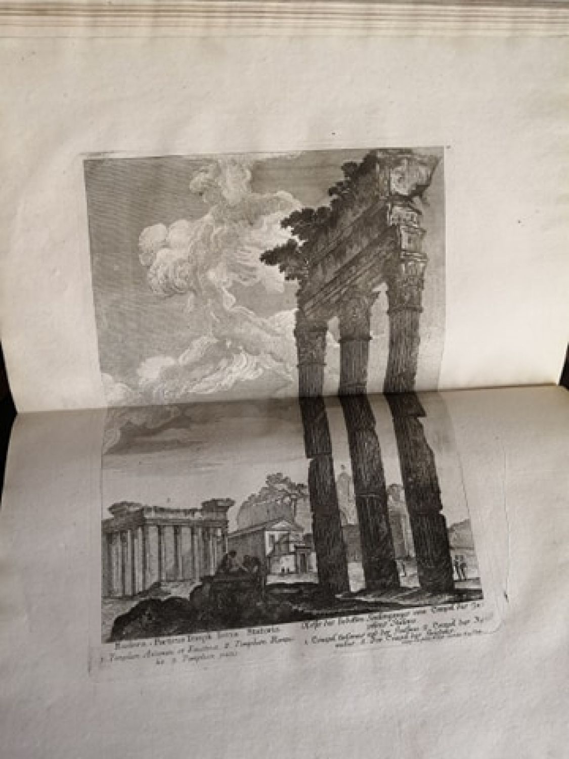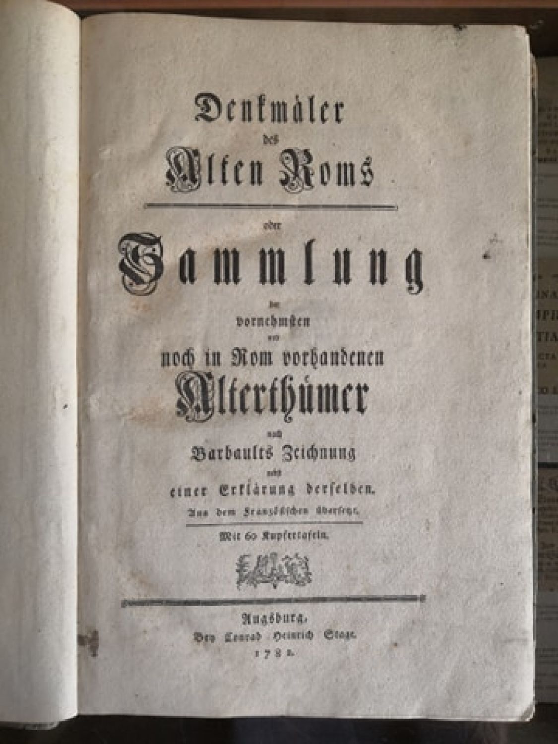 Fromm 1755; Ebert 1619<br>Německý text gotikou, latinský antikvou, dřevořezové viněty a vlys na posledním tištěném listu (rejstřík), na první straně textu při horním okraji mědirytina v jednoduchém rámečku o rozměru desky 95 x 175 mm, za úvodním textem 57 dvoustránkových tabulí (z 60 tři chybí) s mědirytinami G. Ch. Kiliana, na kterých jsou vyobrazeny ruiny památek z doby antického Říma, pod některými též vyobrazení detailů a fragmentů sochařské a malířské výzdoby a vlysů. Tabule jsou číslovány 1-6; 1-54. Georg Kilian mědirytiny vytvořil podle kreseb Jeana Barbaulta, původní francouzské vydání vyšlo roku 1761.<br>Dobová kartonová vazba, ohmataná a místy odřená, při spodním i horním okraji hřbetu chybí kousek pap. pokryvu, naražené rohy. <br>Georg Christoph Kilian ( 4.1. 1709- 15.6. 1781 Augsburg), německý rytec z významné rodiny rytců tvořících po generace v německém Augsburgu.