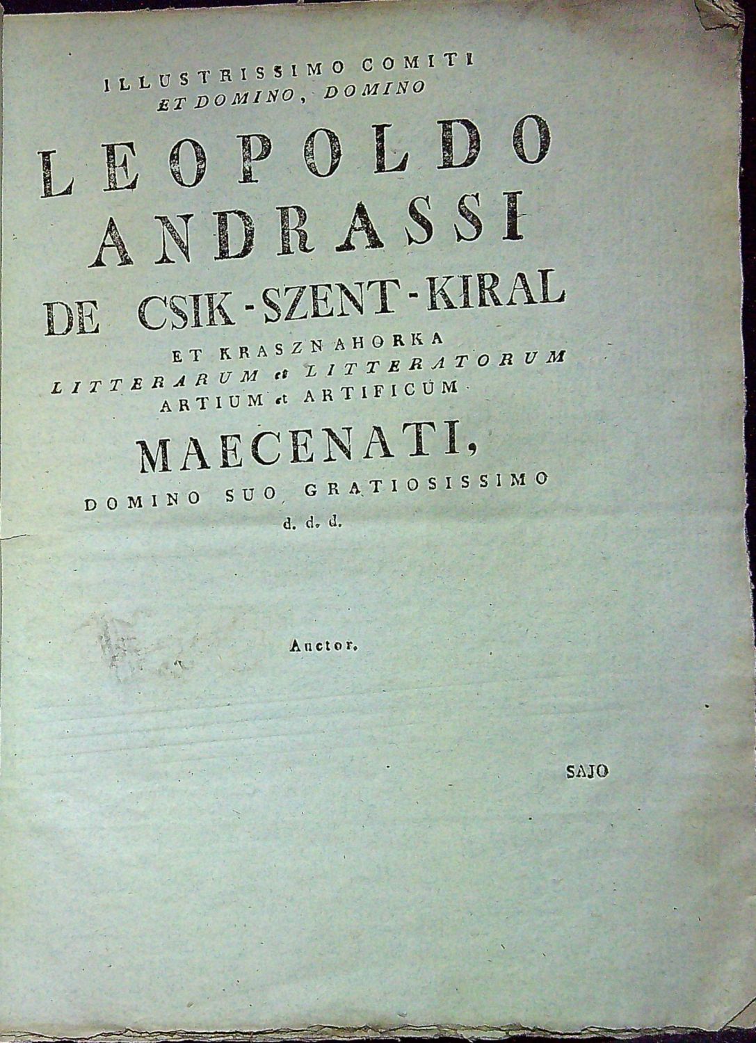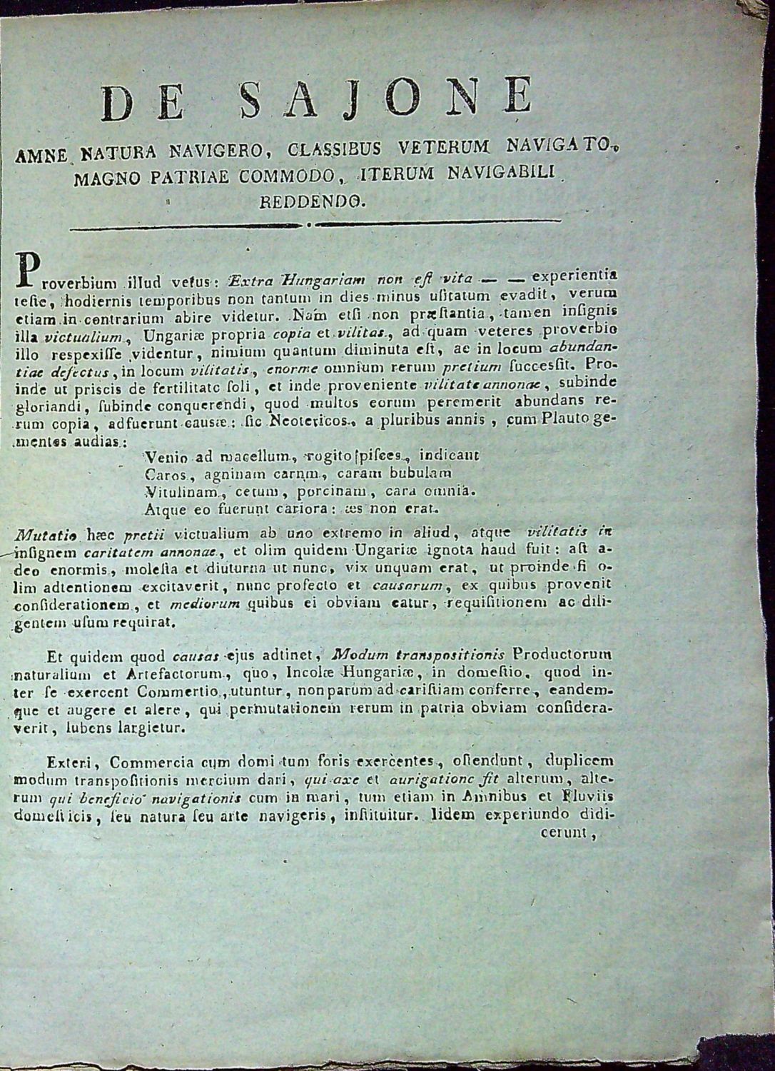 DE SAJONE AMNE NATURA NAVIGERO, CLASSIBUS veterum navigato, magno totius Patriae, imprimis Hungariae Cis et Trans Tibiscanae, ac Comitatuum Borsod, Gömör, Szepes, Lipto, Zolyom et Nograd commodo, iterum navigabili reddendo.