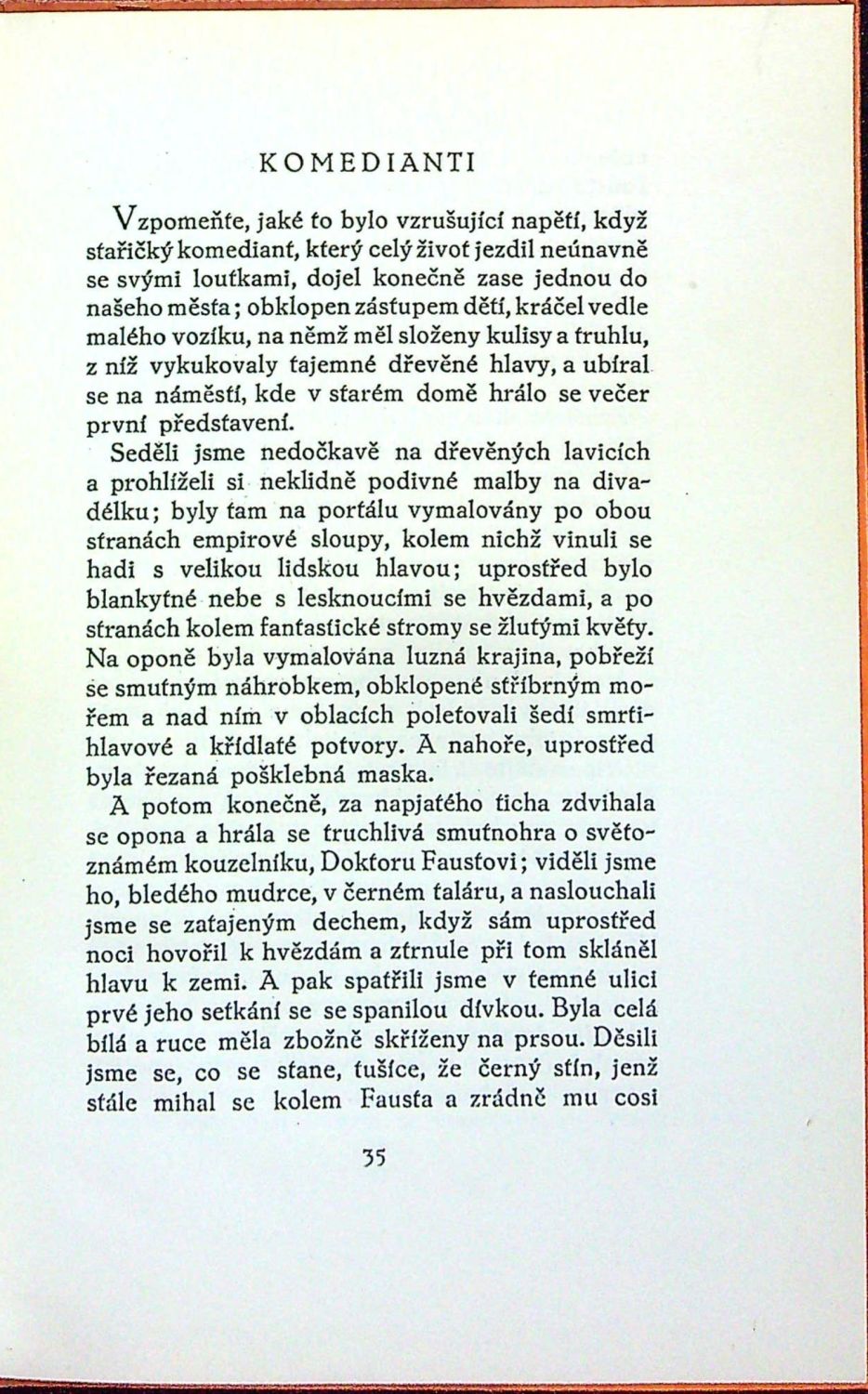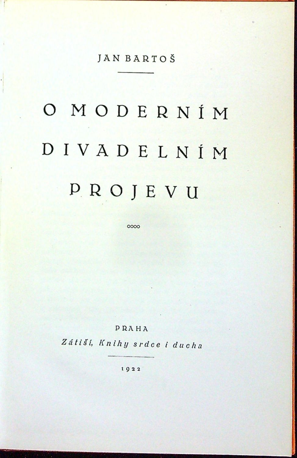 Původní kartonová vazba s reprodukcí kresby Bedřicha Feuersteina na přední desce vazby, svázal František Kadeřábek. Na přední předsádce rkp. dedikace černým perem "Milému příteli arch. B. Feuersteinovi na památku Jan Bartoš".
