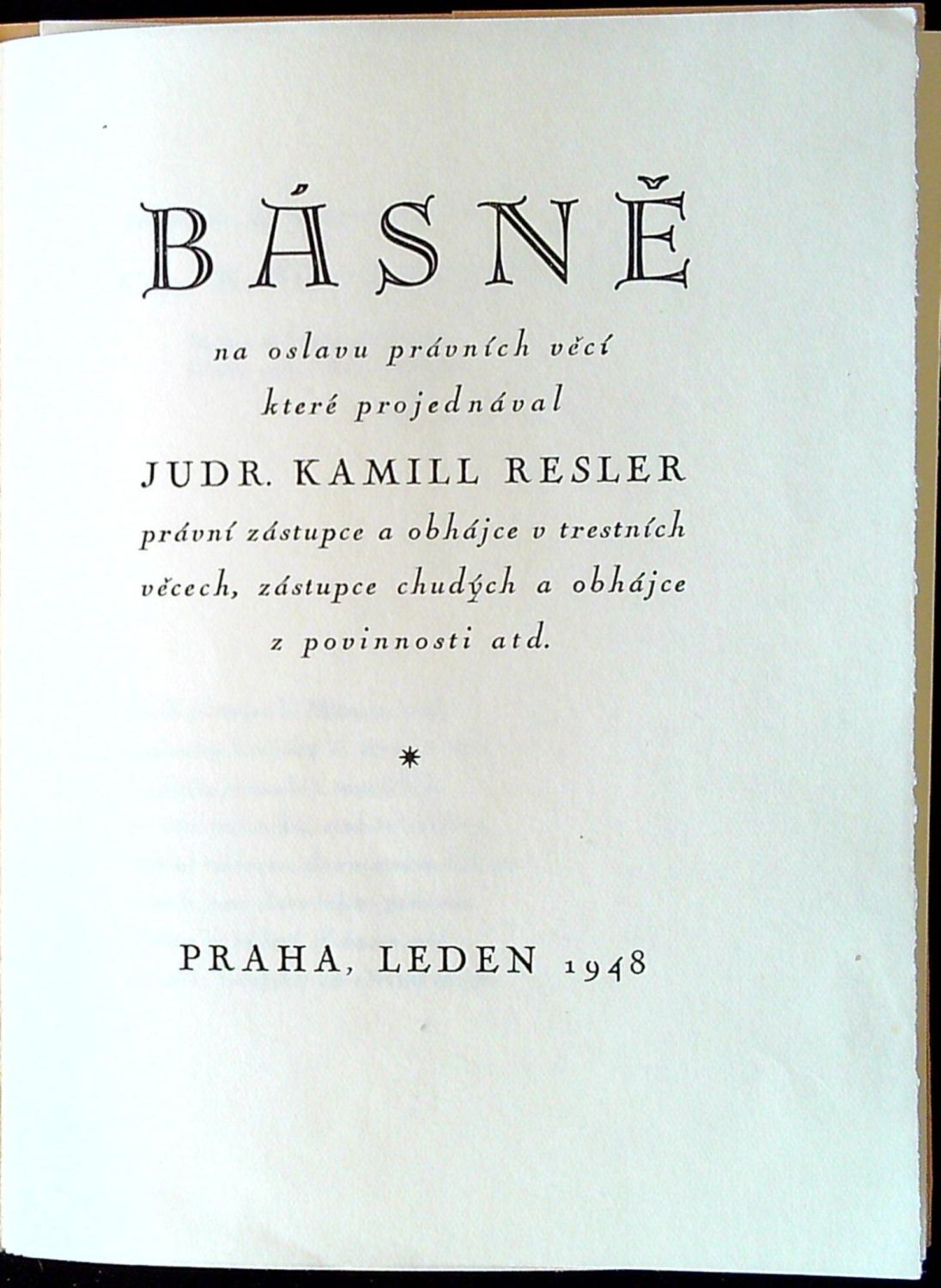 Básně na oslavu právních věcí které projednával JUDr. Kamill Resler právní zástupce a obhájce v trestních věcech, zástupe chudých a obhájce z povinnosti atd.