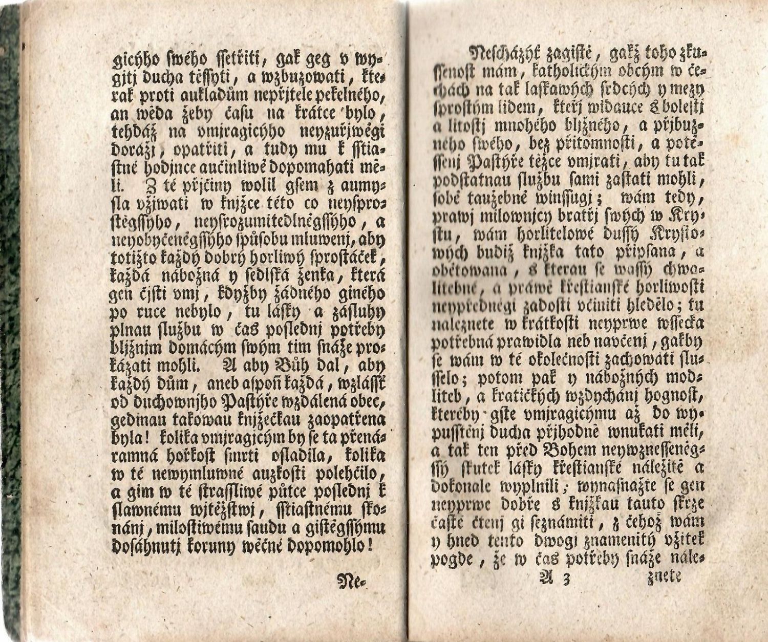 Knihopis 1002<br>Gotika, latinská slova antikvou, signatury, stránkové kustody, arabská paginace stran při horním vnějším okraji, uprostřed horního okraje stran tiskařská ozdůbka, tučně tištěné plné iniciály ve výši 1-2 řádků, od strany 38 Díl druhý, od str. 145 Díl třetí. V záhlaví prvního dílu dřevořezový vlys, v záhlaví dílu II. a III. ozdobné lišty, koncová viněta. Z druhého německého vydání do českého jazyka přeložil Jan Chmela.<br>Kartonové desky potažené mramorovaným papírem, plátěný hřbet z počátku 19. století. Vazba ohmataná a místy lehce odřená, plátno ve hřbetu místy proděravělé. Na několika posledních listech při horním vnějším okraji drobné světle hnědé skvrnky. Na titulním listu propisovací tužkou poznámka z druhé půle 20. století o datu tisku nejstarší knihy v českém jazyce podobného obsahu.<br>Krom modliteb a litanií obsahuje knížka řadu naučení jak připravit na šťastný a důstojný odchod umírajícího člověka a naopak čeho se vyvarovat z hlediska věřícího katolíka.