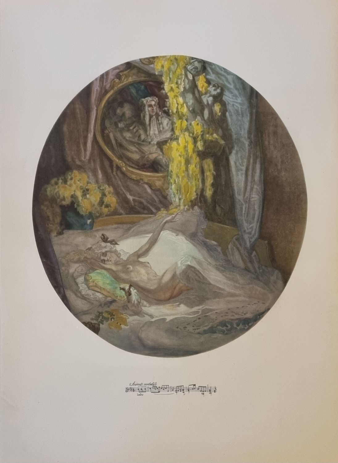 Ex. č. 312 z 1-900 výtisků vydání B. - Původní kartonová vazba, ve které je volně vložený dvoulist s tit. listem, seznamem prací a tiráží + 10 listů s Bayrosovým cyklem barevných akvarelů vytištěných ve "Spamersche Buchdruckerei" v Lipsku. (498 x 365 mm rozměr vazby). Titulní list potrhaný.