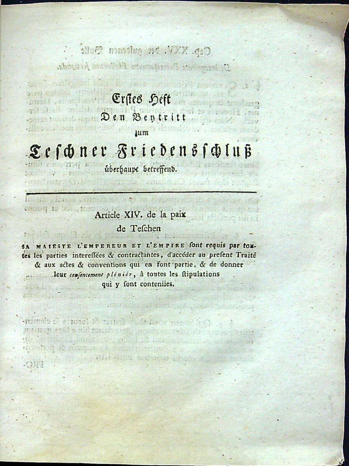 BCBT 12021<br>Německý text švabachem, francouzská a latinská slova antikvou. Na tit. listu rokoková viněta, impresum pod ozdobnou tyčí, uprostřed horních stran drobné rostlinné ozdůbky, v záhlaví strany 3 rokokový pásový vlys, ozdobné mizící tyče, vstupní tučně tištěná iniciála zalomená do výše 3 řádků. Od strany 33 druhý sešit, průběžná paginace. - Původní brožura přes hřbet přelepená pap. páskou.<br>Těšínský mír byl uzavřen 13. května roku 1779 v Těšíně v den narozenin císařovny Marie Terezie za účasti delegátů sedmi zúčastněných zemí (Rakouska, Pruska, Saska, Bavorska, Francie, Ruska a vévodství Zweibrücken). Těšínská mírová smlouva ukončila řadu válek vedených od roku 1740 pruským králem Bedřichem II., bavorským a saským kurfiřtem a polským králem Augustem II. proti habsburské monarchii.