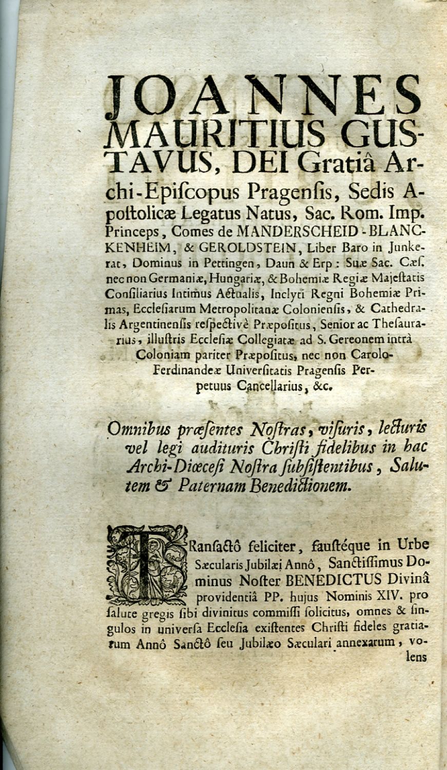| Ilustrace: | Na titulním listu dřevořezová viněta s papežským znakem olemovaná po stranách stojícími postavami sv. Petra a Pavla, plná iniciála na pozadí světce v rostlinném rámci zalomená do výše 4 řádků, plastická iniciála na rostlinném pozadí ve výši 8 řádků. |