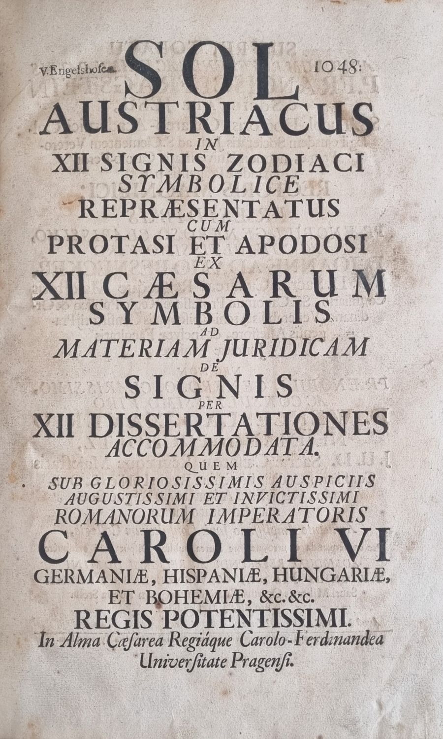 SOL AUSTRIACUS IN XII SIGNIS ZODIACI SYMBOLICE REPRAESENTATUS CUM PROTASI ET APODOSI EX XII CAESARUM SYMBOLIS AD MATERIAM JURIDICAM DE SIGNIS PER XII DISSERTATIONES ACCOMODATA. QUEM SUB GLORIOSISSIMIS AUSPICIIS AUGUSTISSIMI ET INVICTISSIMI ROMANORUM IMPERATORIS CAROLI VI GERMANIAE, HISPANIAE, HUNGARIAE, ET BOHEMIAE, etc. etc. REGIS POTENTISSIMI. In Alma Caesarea Regiáque Carolo-Ferdinandea Universitate Pragensi. (in verso): SUB RECTORATU ADMODUM REVERNDI, AC EXIMII PATRIS P. FRANCISCI FRAGSTEIN e Societate JESU, SS. Theol. Doctoris, Caesaro-Academici Collegii ejusdem Societatus Jesu ad S. Clementem Vetero-Pragae, nec non Universitatis Carolo-Ferdinandae Pragensis p. t. RECTORIS MAGNIFICI: PRAESIDIBUS PRAENOBILI, GENEROSO, CLARISSIMO, AC CONSULTISSIMO VIRO D. JOANNE ADAMO BESNECKER, J. U. D. Sacrae Caesareae Regiaeque Majestatis Consiliario, SS. Canonum Professore Regio Publico & Ordinario, Venerabilis Archi-Episcopalis Consistorij Pragensis Assessore, & Inclytae Facultatis Juridicae S