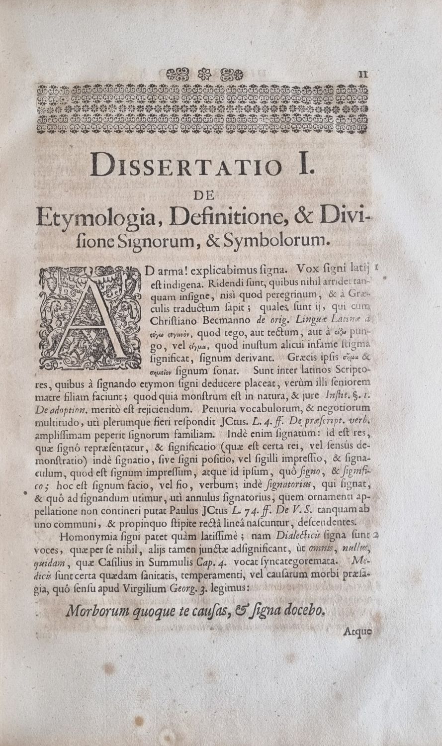 BCBT 10042; BCBT 20674<br>Latinský text antikvou, německá slova švabachem, řecká alfabetou, impresum pod jednoduchou linku na versu tit. listu, živá záhlaví oddělená od sazby jednoduchou linkou, konturové iniciály na ilustrativním pozadí zalomené do výše 4-9 řádků, pásový vlys v jednoduchém rámečku s korunou, žezlem a mečem zakomponovanými mezi ornamenty, ozdobné tyče z ornamentů, drobné tiskařské ozdůbky, barokní rozvilinové viněty. <br>Dobová vazba z hnědé hověziny, ve hřbetu 5 vazů, v jednotlivých polích tlačený ornament, barvené ořízky. Vazba ohmataná a místy odřená, při horním i spodním okraji hřbetu chybí kousek koženého pokryvu, naražené rohy, papír místy lehce zahnědlý. Na titulním listu vlastnické razítko "V. Engelshofen" a číslo svazku "1048".<br>Johann Adam Besnecker (narodil se v druhé pol. 17. století v Chebu - 9.10. 1721 Praha), právník a profesor práva na pražské universitě, autor řady významných právních spisů. Proslul též jako varhaník u křížovníků s červenou hvězdou.<br>Engelshofen, rod původním jménem Ponz, roku 1607 povýšený do rytířského stavu, roku 1768 a 1770 získal Franz Ferdinand Ponz von Engelshofen majetek rodu Hegenmüllerů, včetně rodové knihovny, kterou následně rozšířil. Roku 1827-28 od Engelshofenů knihovnu zakoupil kníže Thun-Hohenstein, ve 30. letech byla děčínská Thun-Hohensteinská knihovna rozprodána v aukcích.