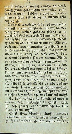 Tištěno švabachem, na tit. listu dřevořez v dvojrámečku 64x49 mm s vyobrazením žebrajícího mrzáka před palácem, do kterého vcházejí dva muži. Na rubu titulního listu v záhlaví lišta ze zdobných paragrafů a uprostřed s drobnou rostlinnou ozdůbkou. Nepaginováno, signatury A-8,B-8,C-7), stránkové kustody. Ve složce B chybně vytištěny a svázány folia B7 a B8 (na rubu folia B-8b vytištěno folio B-7b; na rubu folia B-8a vytištěno folio B-7a). - Pokud není nabízený exemplář Z největší pravděpodobností se jedná o tisk A. J. Landfrase z konce 20.let 19. století (stejnou lištu použil Landfras v jiných jím vydaných anonymních tiscích). Vydávání antidatovaných tisků bylo Landfrasovou specialitou, pokud neměl schválenou censuru.