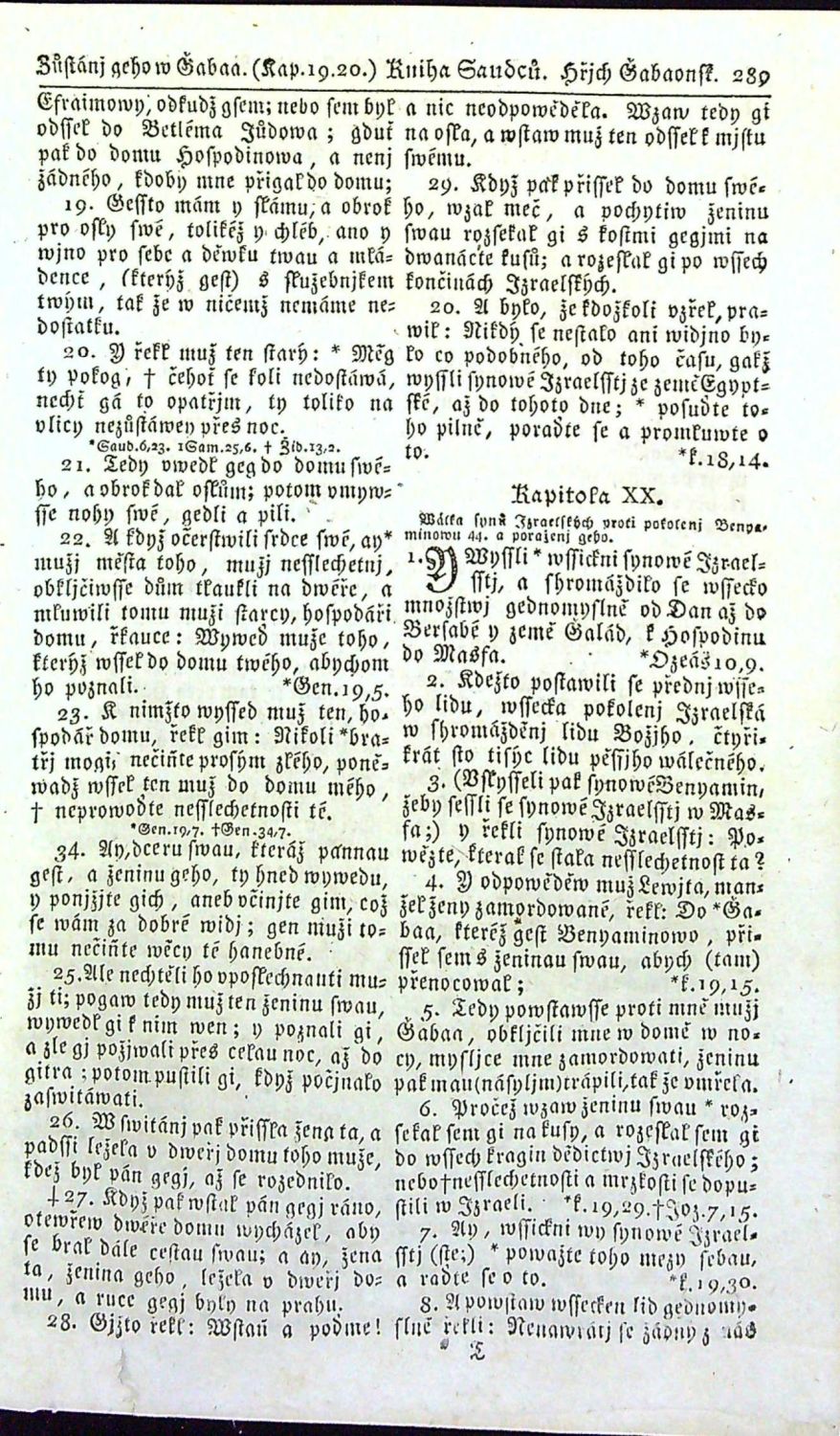 Knihopis 1118<br>Tištěno švabachem ve dvou sloupcích, živá záhlaví od sazby oddělená jednoduchou linkou. Červeno-černě tištěný titulní list s mědirytinovou vinětou, vstupní prolamovaná ozdobná tyč, plné iniciálky zalomené do výše 2 řádků. Za titulním listem na dvou listech seznam předplatitelů.<br>Dobová vazba, kartonové desky potažené mramorovaným papírem, kožený hřbet a nárožnice, ve hřbetu pole dělená ozdobnou tlačenou a zlacenou linkou, ve druhém poli světle hnědý kožený štítek s tlačeným a zlaceným názvem, ve čtvrtém poli stejný štítek (odřený, v ostatních polích tlačený ornament. Na rubu tit. listu stará vlastnická značka "JB". Vazba ohmataná a místy odřená, naražené rohy. - Pouze Starý Zákon.