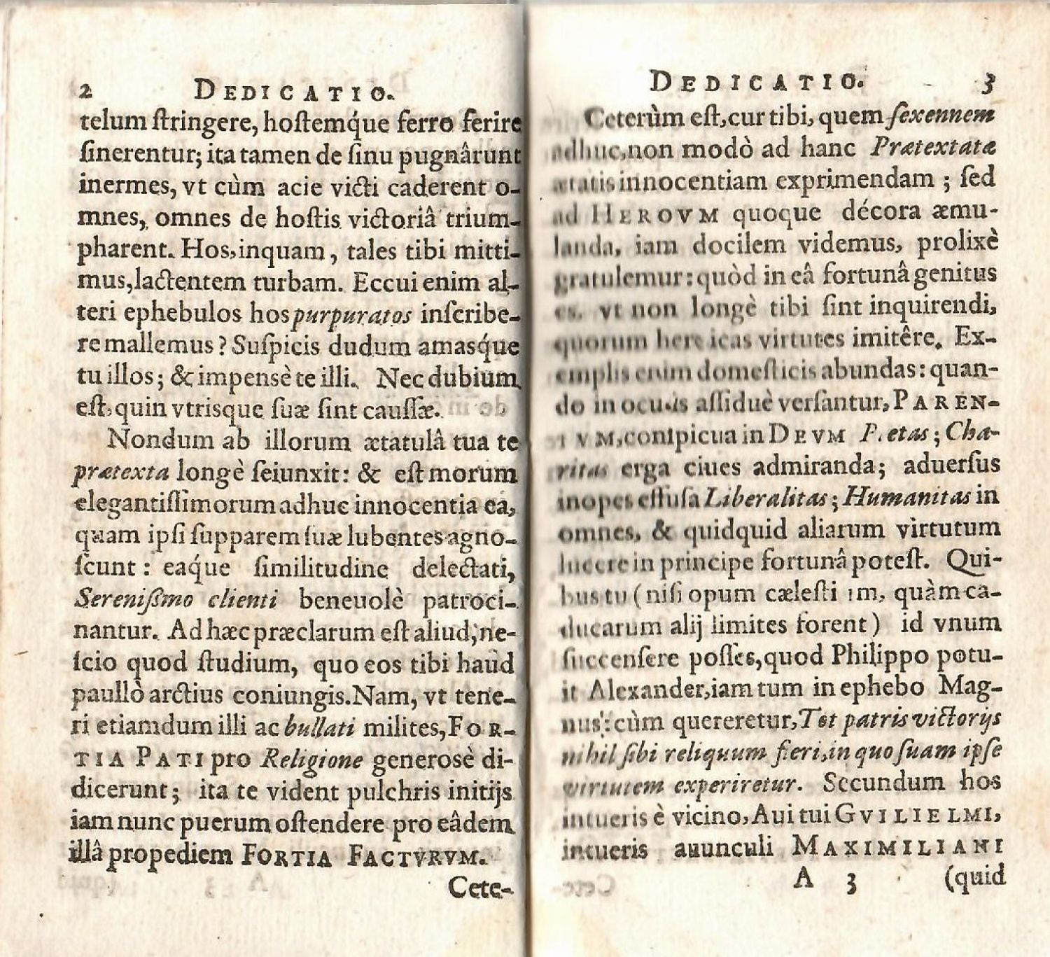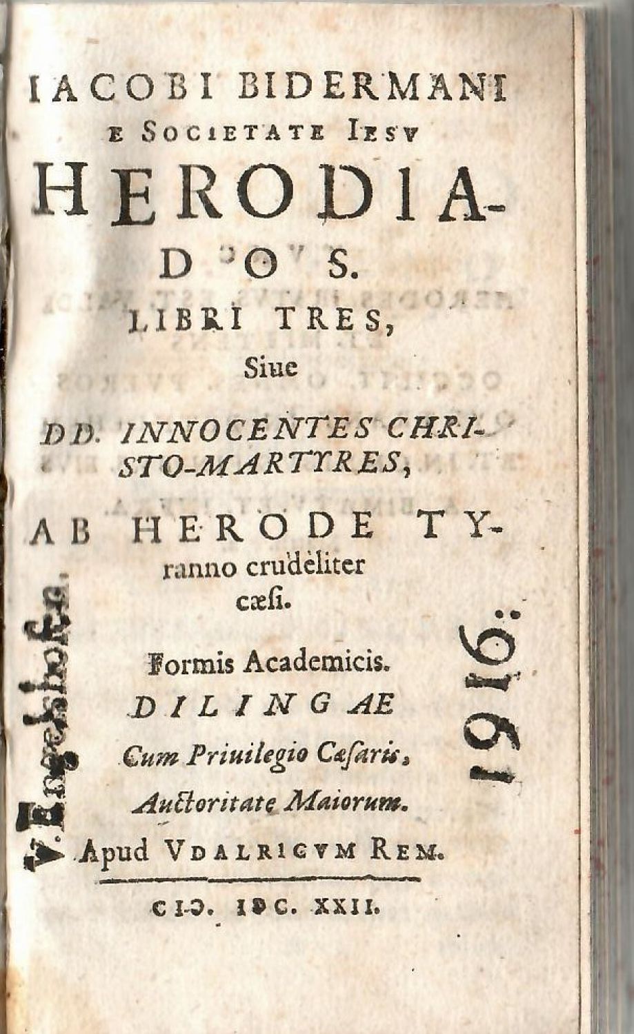 Backer-Sommervogel I,1449; Dünnhaupt str. 561,25.1.<br>Konturové iniciály na rostlinném a ilustr. pozadí zalomené do výše 5-6 řádků, živá záhlaví.<br>Dobová pergamenová vazba, lehce stříkané ořízky. Na tit. listu staré vlastnické razítko "V. Engelshofen 1916"<br>V. Engelshofen, rod původním jménem Ponz byl v roce 1607 povýšen do rytířského stavu, roku 1768 a 1770 získal Franz Ferdinad Ponz von Engelshofen majetek rodu Hegenmüllerů, včetně rodové knihovny, kterou pak následně rozšířil. Roku 1827-8 od Engelshofenů knihovnu zakoupil kníže Thun-Hohenstein, ve 30. letech 20. století byla děčínská Thun-Hohensteinská knihovna rozprodána v aukcích.<br>Jacob Bidermann (1578 Ehingen u Ulmu - 20.8. 1639 Řím), katolický kněz, jesuita a profesor teologie a filosofie v Dillingenu, autor několika dramatických her a latinsky psané poesie.
