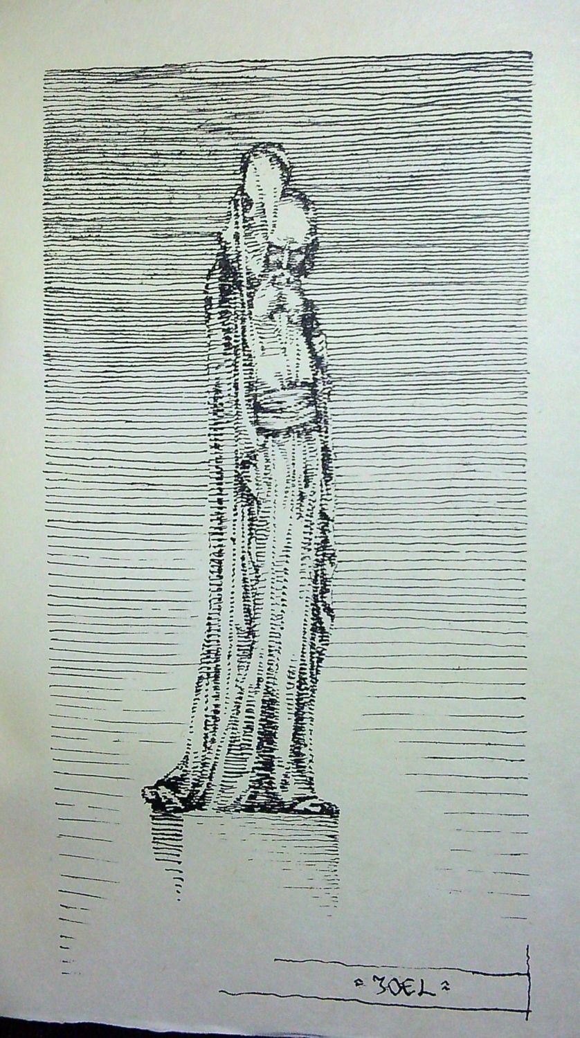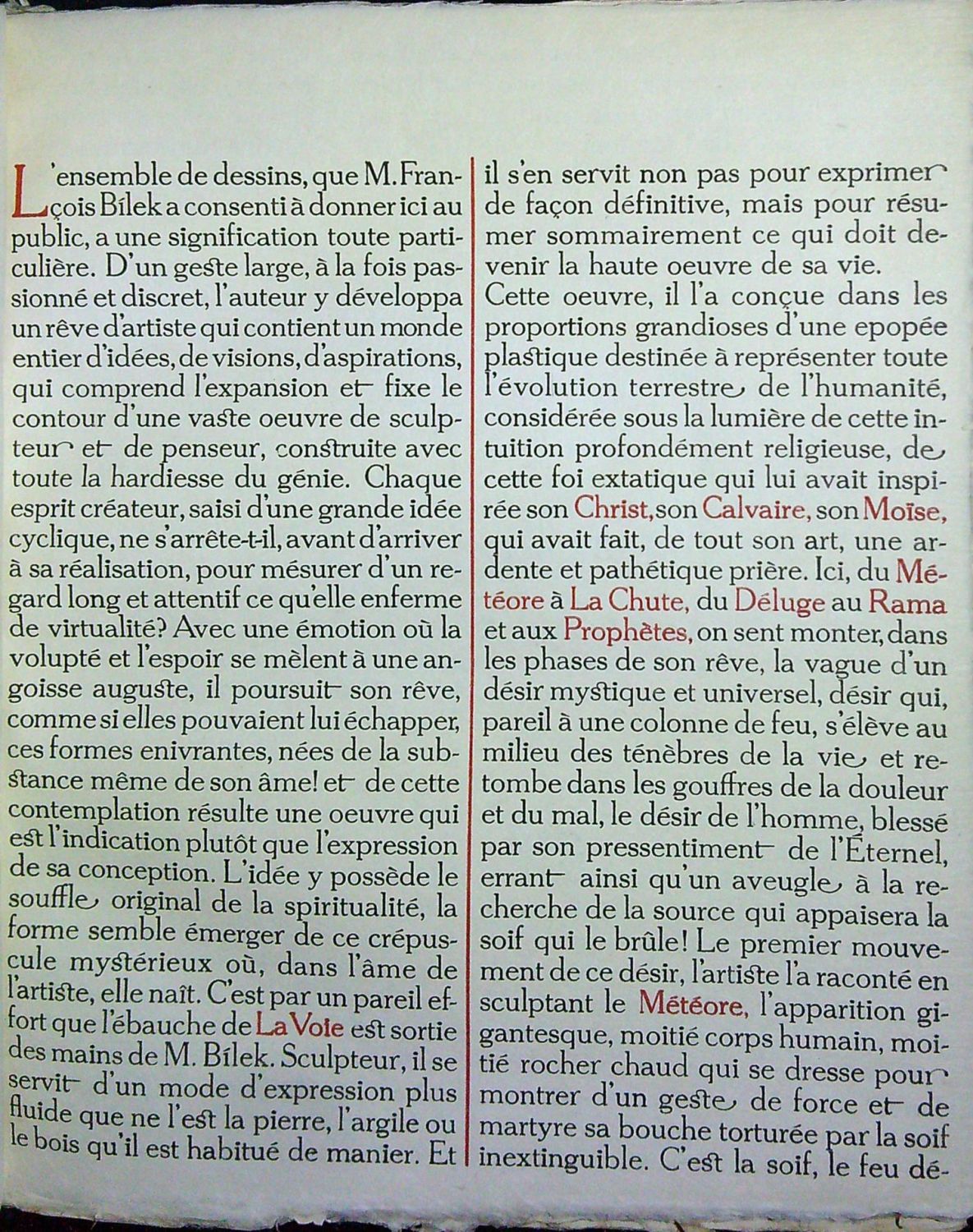 Ex. č. 72 ze 143 výtisků tištěných na japanu (celkový náklad byl 400 ex.), na líci tiráže a na tit. listu Bílkovy dřevořezy, 37 (z toho 3 oboustranné) Bílkových celostr. litografií vytištěných Ant. Vítkem, původní pergamen. vazba Ludvíka Bradáče, na přední desce zlacený a tlačený Bílkův obraz poutníka, původní vázací tkanice. Za tit. listem ve dvou sloupcích dvoubarevně tištěná předmluva Miloše Martena (francouzsky a česky), za ní na jednom listu ve dvou sloupcích česko-francouzsky dvojbarevně tištěný úryvek z Bílkovy knihy "Stavba budoucího chrámu v nás".<br>Vazba ohmataná a lehce zašpiněná, na některých listech drobné hnědé skvrnky, mezi jednotlivými litografiemi vevázaný jemný ochranný papír.