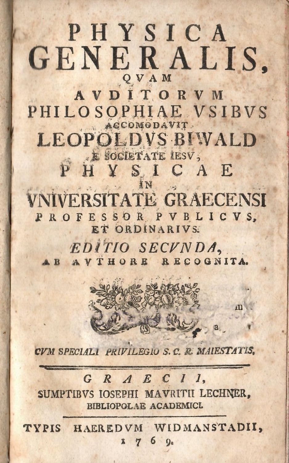 PHYSICA GENERALIS, QUAM AVDITORVM PHILOSOPHIAE VSIBVS ACCOMODAVIT LEOPOLDVS BIWALD E SOCIETATE IESU, PHYSICAE IN VNIVERSITATE GRAECENSI PROFESSOR PVBLICVS ET ORDINARIVS.