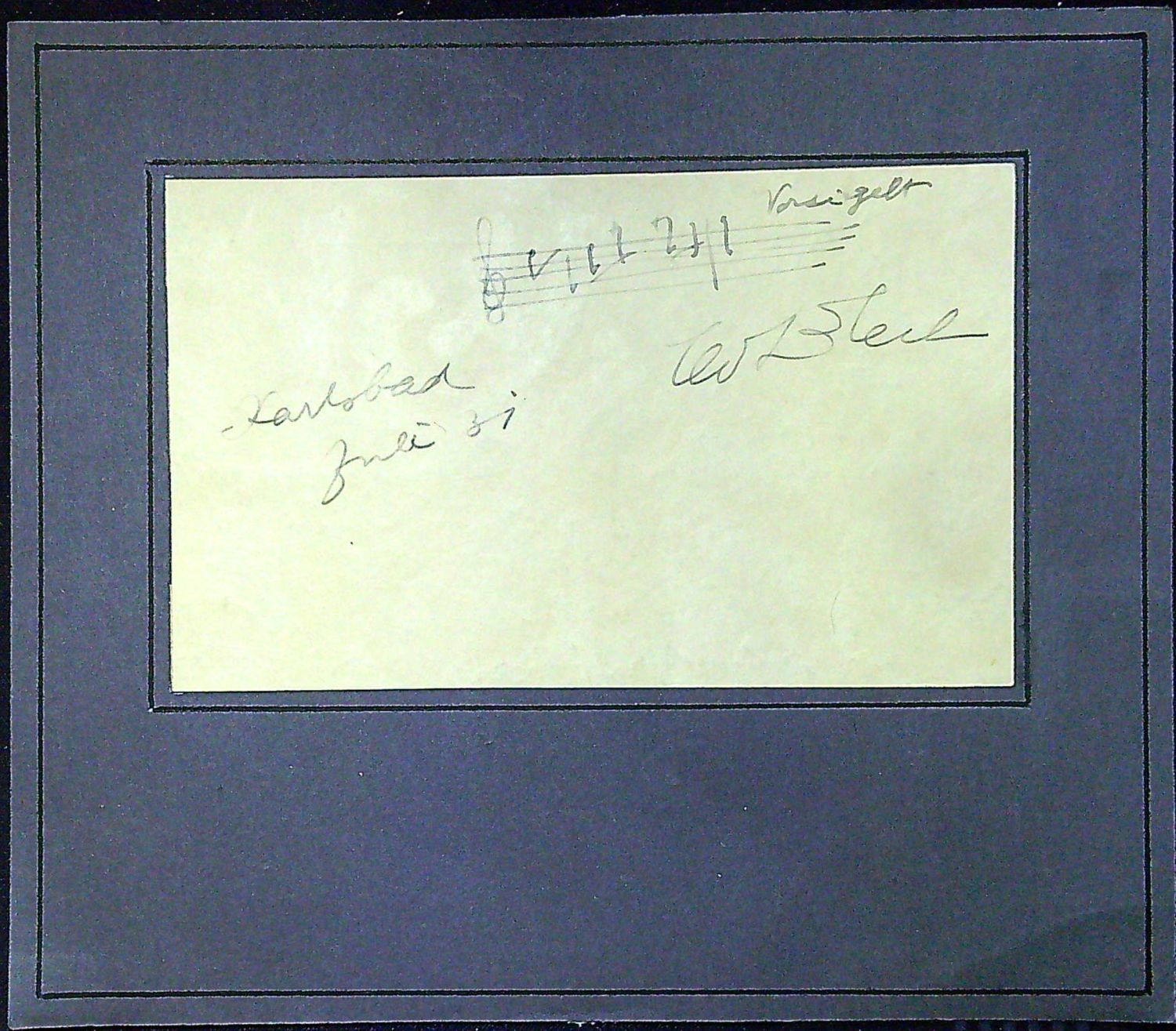 Pětiřádková krátká úvodní notace s podpisem a datací "Karlsbad Juli 31", psaná inkoustem. (rozměr kartičky 85x138 mm).<br>Leo Blech (21.4. 1871 Cáchy - 25.8. 1958 Západní Berlín) skladatel a dirigent, v letech 1899-1906 dirigoval v pražském Novém německém divadle, roku 1913 byl jmenován generálním hudebním ředitelem Královské opery v Berlíně, v letech 1923-1926 působil v různých operních domech v Berlíně a ve Vídni. Roku 1926 se vrátil do Královské opery (přejmenované na Státní operu), kde působil až do roku 1937, kdy musel pro svůj židovský původ odejít do exilu v lotyšské Rize, kde dirigoval v Lotyšském národním divadle. Po německé okupaci Lotyšska vydal H. Göring s ohledem na velké mezinárodní Blochovo renomé rozkaz k udělení víza Blochovi do Švédska.