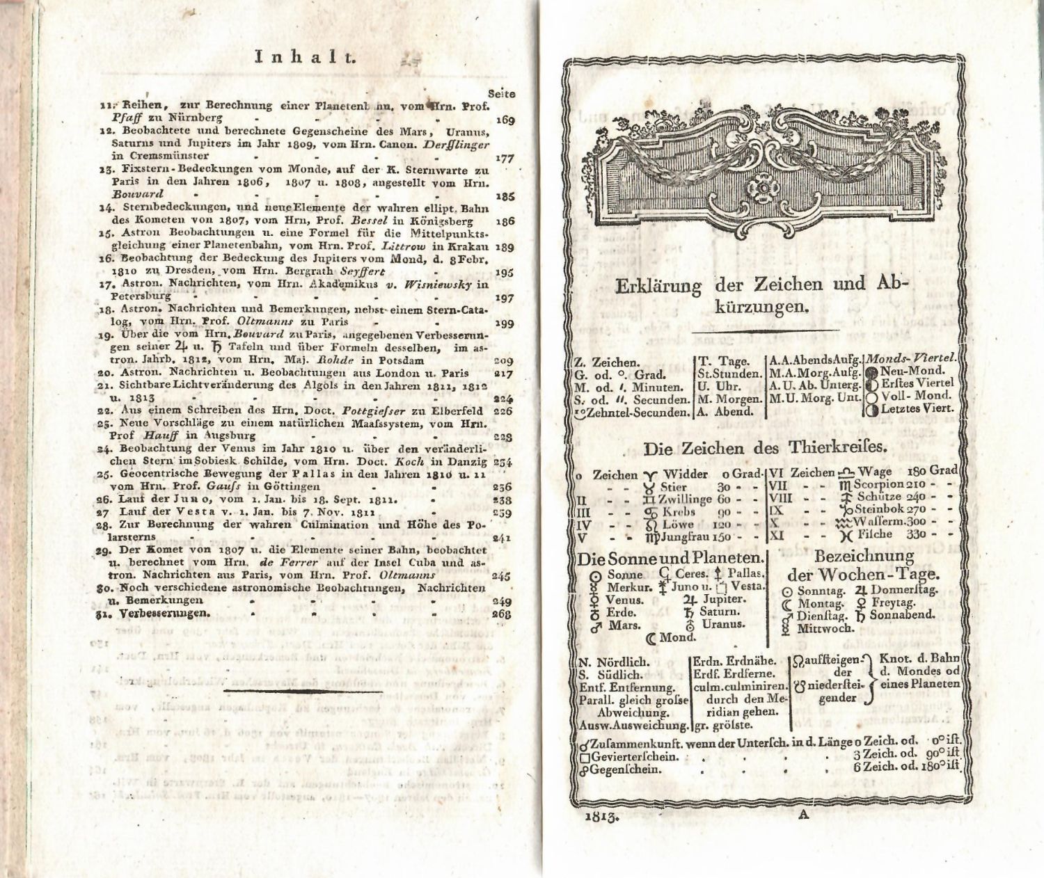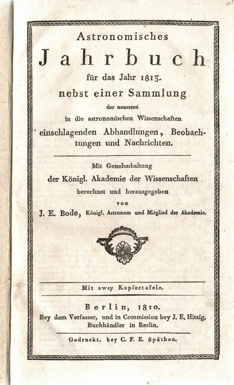 Astronomisches Jahrbuch für das Jahr 1813. nebst einer Sammlung der neuesten in die astronomischen Wissenschaften einschlagenden Abhandlungen, Beobachtungen und Nachrichten.