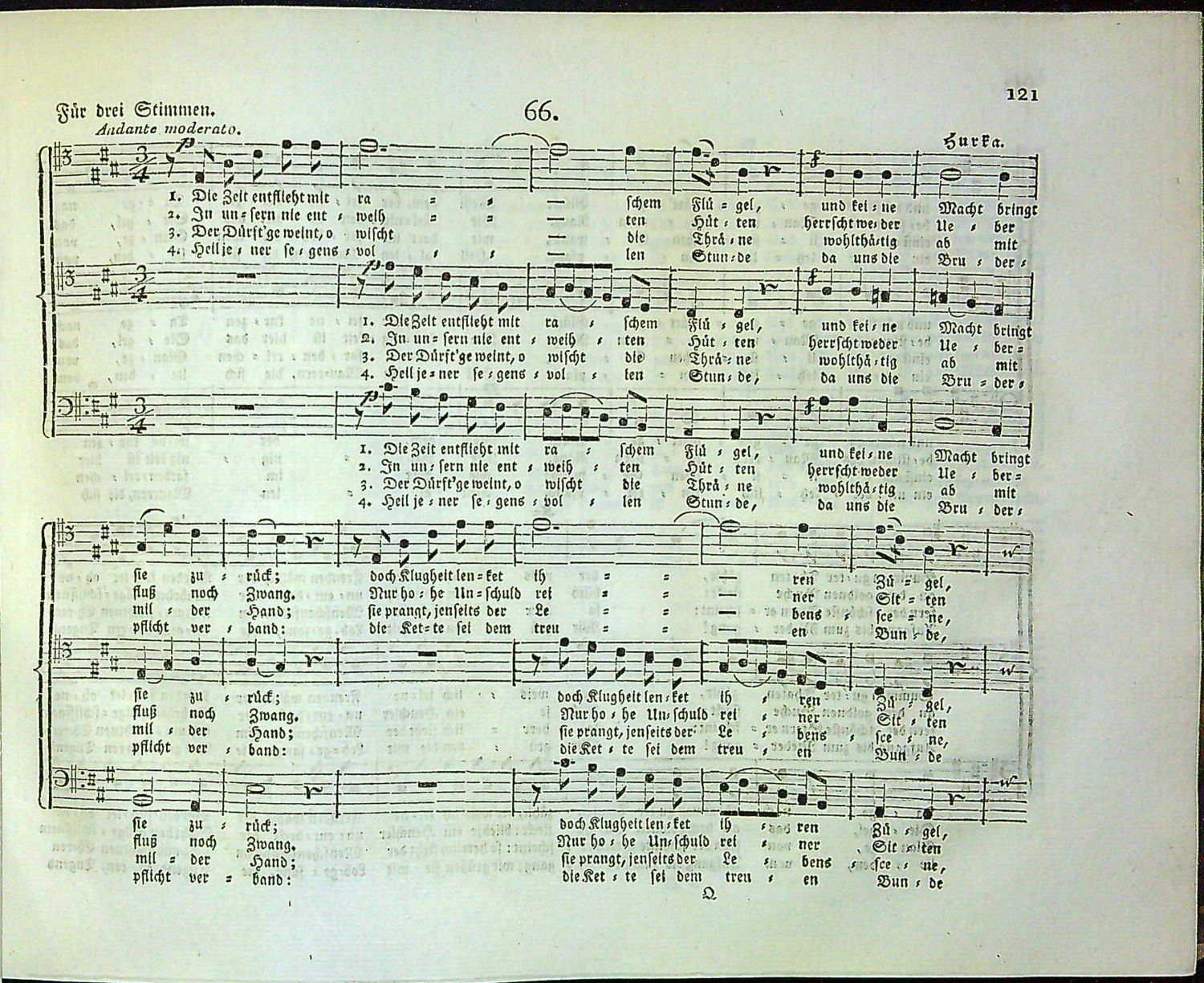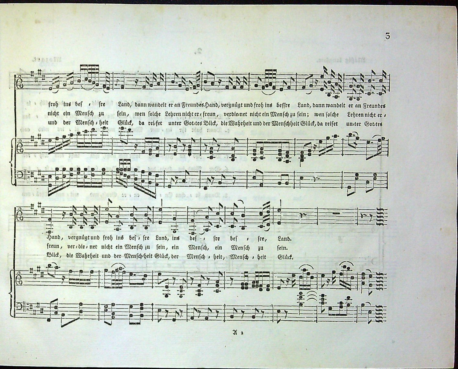 Eitner II, 85; Wolfstieg 39844<br>Podlouhlý 4° (205 x 270 mm), texty písní tištěny švabachem, titulní listy antikvou, tištěná notace celkem 215 zednářských písní. V obou dílech za titul. listy tištěný seznam subskribentů a úvodní slovo vydavatele Fr. Maurera. <br> Dobová vazba s kartonovými deskami potaženými mramorovaným papírem, kožený hřbet a nárožnice, ve hřbetu 4 vazy olemované jednoduchou zlacenou linkou, ve druhém poli zlacený název, zeleně barvené ořízky, vazba lehce odřená, mírně naražené rohy<br>Joseph Michael Böheim (cca 1750 Praha - 4.7. 1811 Berlín) operní pěvec, herec v činohře a básník, první angažmá získal v Hamburku (1773-77), poté působil dva roky ve Vratislavi a od roku 1779 různá angažmá (Berlín, Schwedt, Frankfurt), od roku 1789 v Národním divadle v Berlíně. Byl členem berlínské zednářské lóže "Zur Beständigkeit".