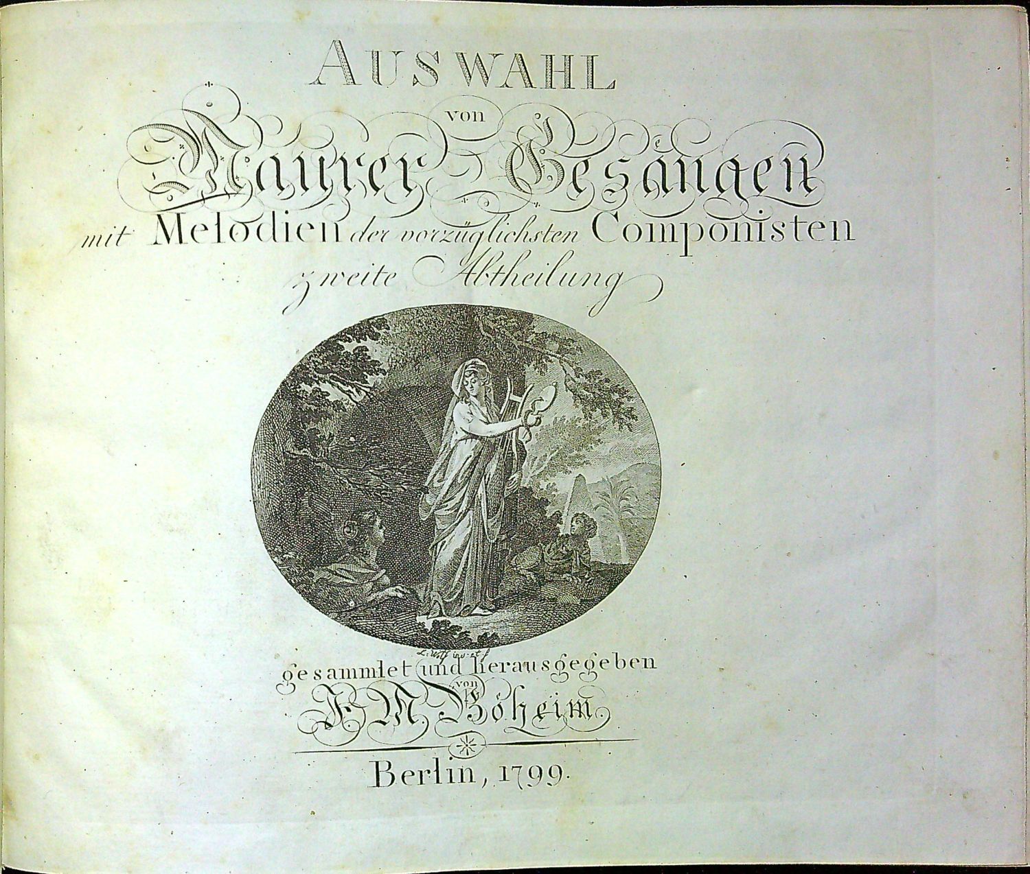 Eitner II, 85; Wolfstieg 39844<br>Podlouhlý 4° (220 x 265 mm), texty písní tištěny švabachem, titulní listy ryté antikvou, tištěná notace celkem 202 zednářských písní (v prvním svazku 78, ve druhém 124).<br>Mramorovaná kožená vazba, na deskách ozdobný rám z tlačeného a zlaceného ornamentu, uvnitř rámu na předních deskách kulaté zrcadlo z ornamentů, uvnitř zrcadla iniciály prvního vlastníka a objednatele vazby "J.C.C.M" a letopočet 1808, zlacené ořízky, na přídeštích a předsádkách dobový tragantový papír. Hřbet dělený dvojitými linkami, ve druhém poli vínově červený kožený štítek s názvem, ve čtvrtém poli zelený oválný medailonek s vyznačením dílu. Vazba ve hřbetu lehce odřená a vyšisovaná. Původní ochranná kartonová pouzdra, odřená a místy potrhaná.br>Joseph Michael Böheim (cca 1750 Praha - 4.7. 1811 Berlín) operní pěvec, herec v činohře a básník, první angažmá získal v Hamburku (1773-77), poté působil dva roky ve Vratislavi a od roku 1779 různá angažmá (Berlín, Schwedt, Frankfurt), od roku 1789 v Národním divadle v Berlíně. Byl členem berlínské zednářské lóže "Zur Beständigkeit".