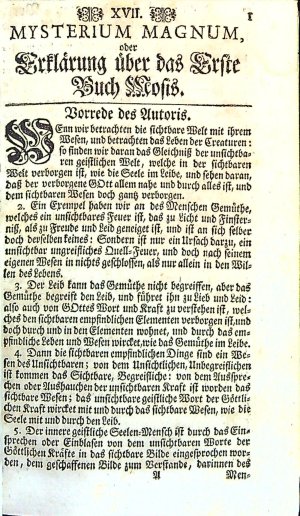 MYSTERIUM MAGNUM, oder Erklärung über Das Erste Buch Mosis, Von der Offenbarung Göttlichen Worts durch die drey Principia Göttliches Wesens, auch vom Ursprung der Welt und der Schöpfung, Darinnen das Reich der Natur und das Reich der Gnaden erkläret wird. Zu mehrerm Verstande des Alten und Neuen Testaments, was Adam und Christus sey; und wie sich der Mensch im Licht der Natur selber erkennen und betrachten soll, was Er sey, und worinnen sein zeitliches und ewiges Leben, auch seine Seligkeit und Verdammniss stehe. Eine Erklärung des Wesens aller Wesen: Dem Liebhaber in Göttlicher Gabe weiter nachzusinnen. Angefangen zu schreiben noch vorm Jahr 1622. und vollendet im Jahre 1623. von ...
