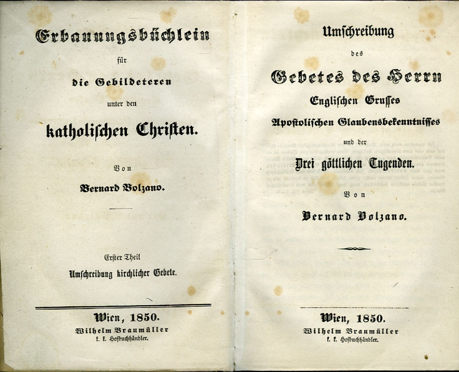 Tištěno frakturou, latinský text antikvou, tištěné poznámky pod čarou, tučně tištěné nadpisy jednotlivých kapitol. Na s. [1]-70 první díl: "Umschreibung des Gebetes des Herrn Englischen Grusses Apostolischen Glaubensbekenntnisses und der Drei göttlichen Tugenden", následuje druhý díl: "Mein Glaube" se samostatným titulním listem. Vpředu Bolzanova předmluva datovaná v Praze o Velikonocích 1820, na začátku druhého dílu předmluva J. M. Fesla datovaná ve Vídni 17.1.1850, za ní předmluva Bolzanova datovaná v Praze 12.5. 1825, na posledních třech nečíslovaných stranách seznam tiskem vydané bolzanovské literatury. - Kartonové desky potažené fialovo-černým mramorovaným papírem, plátěný hřbet a nárožnice, modře mramorované ořízky. Desky odřené, na předních a zadních listech hnědé skvrny.<br>Velmi vzácné vydání, které k tisku po smrti Bolzanově připravil Josef Michal Fesl (29.9.1788 Praha - 6.2.1864 Vídeň), katolický kněz a spisovatel, od roku 1816 profesor a druhý představený kněžského semináře v Litoměřicích. Byl Bolzanovým žákem a obdivovatelem, poté co byl Bolzano roku 1820 suspendován, stihl ho stejný osud. Byl zatčen a internován ve Vídni, pod nátlakem se od Bolzanových myšlenek distancoval, po krátkém čase vyplněném výčitkami svědomí se k Bolzanovy opět přiklonil. Byl znovu internován a zbytek svého života strávil v Rossau a nakonec ve Vídni. Zcela se věnoval propagaci Bolzanova díla a k vydání připravil několik jeho prací. Byl také jedním z největších příznivců a mecenášů Národního muzea, do kterého odkázal svoji literární písemnou pozůstalost, knihovnu s 12 tisíci svazky a také pozůstalost B. Bolzana, která byla v jeho vlastnictví.
