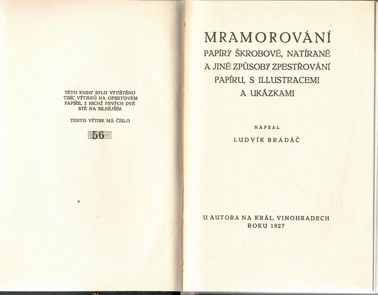 Č. ex. 56/200. Desky potaženy černým plátnem. Ve hřbetu tlačený a zlacený věcný název. Příloha obsahuje 23 vlepených ukázek barveného papíru, z toho dvě ukázky v tomto exempláři chybí. Na patitulu a předním přídeští signováno Jiřím Šalamounem.