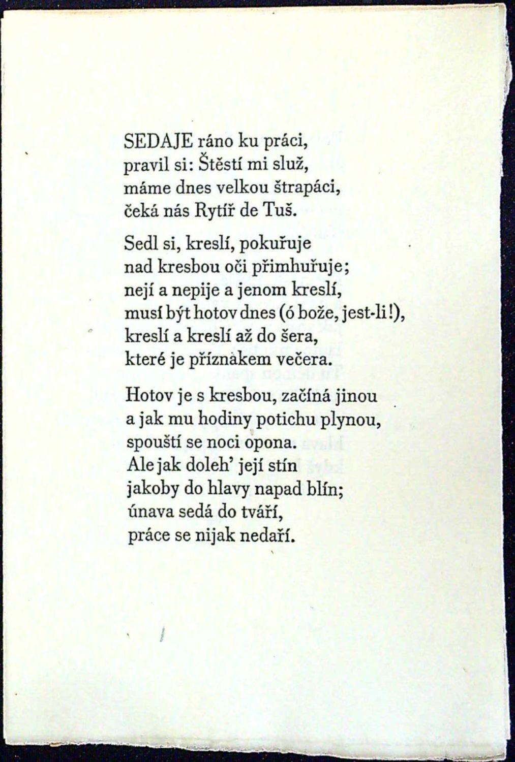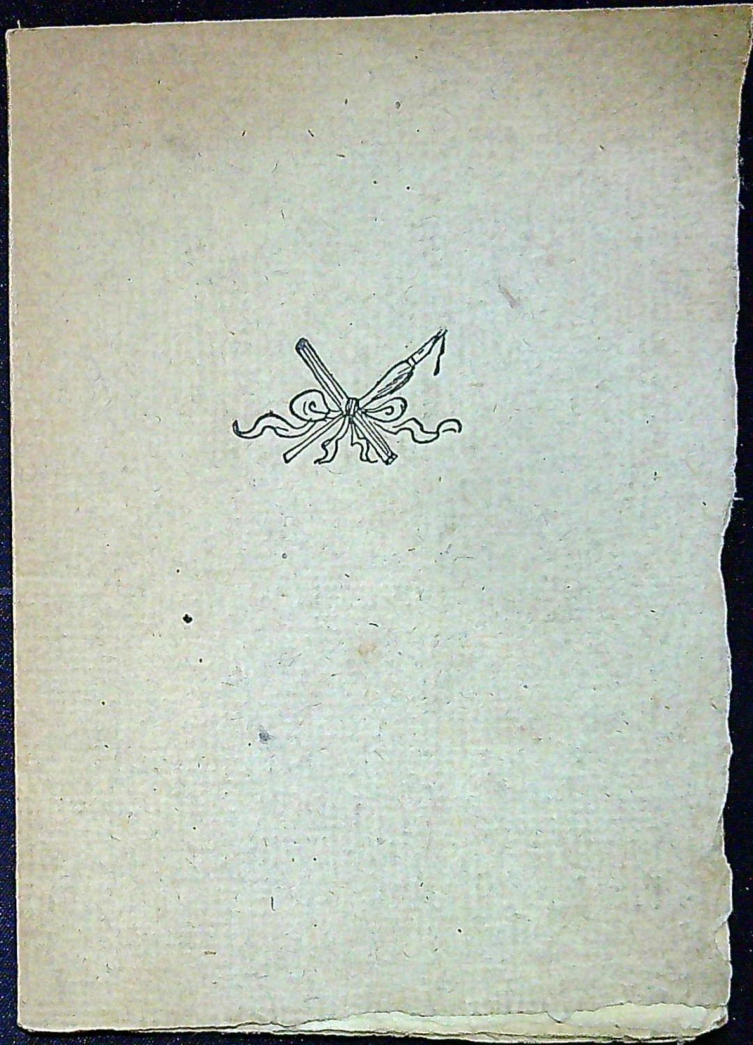 Ex. č. 33 z 35 vydaných výtisků, které podle Brunnerova rukopisu vytiskl Jaroslav Picka. Původní obálka ze škrobového papíru, ve které je volně vložený složený knižní blok. Na tit. listu viněta, stejná na přední straně obálky.