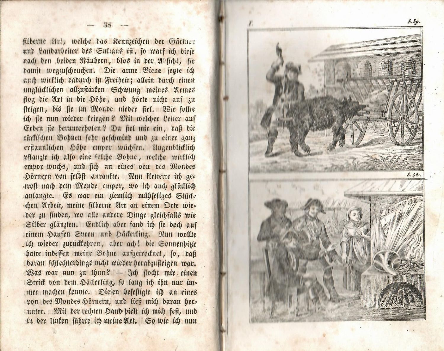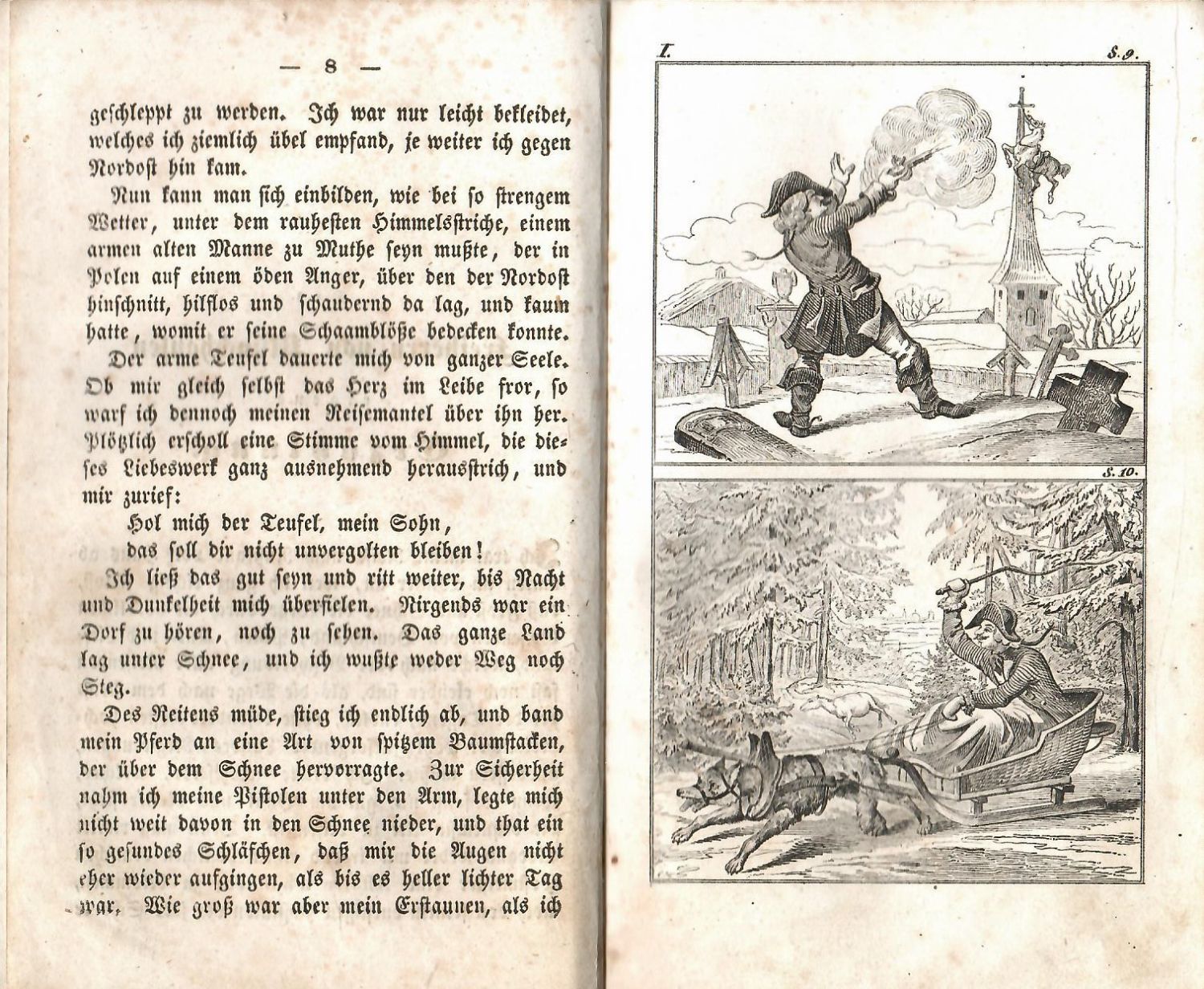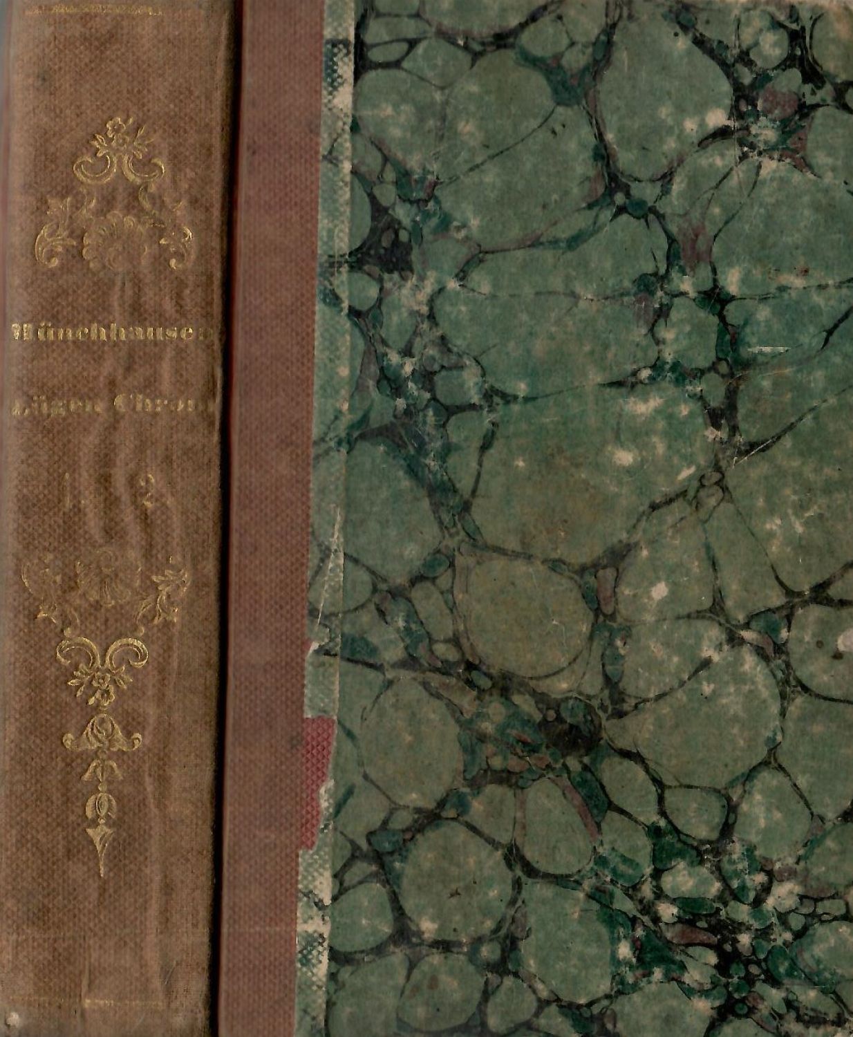 Rümann 275; Hayn-Got. V,237<br>Tištěno švabachem. - Dobová vazba s kartonovými deskami potaženými mramorovaným papírem, plátěný hřbet, ve hřbetu tlačený a zlacený název a rostlinné ornamenty, barvené ořízky. Vazba ohmataná a místy lehce odřená, naražené rohy. Na přední předsádce soukromý vlastnický přípis. <br>Kniha vyšla jako doplňující svazek k dílu G. A. Bürgera "Baron Prášil", kterou autor přeložil z angličtiny a rozšířil o celou řadu dalších neuvěřitelných příběhů a fantaskních historek (kniha vyšla poprvé roku 1786). Předtitul nese název "Lieblingsbücher in alten und neueren Geschichten, Sagen und Schwänken. Zur Ergötzlich für Stände in eine Sammlung gebracht, auch bin und wieder mit dienlichen Bildern geziert durch Willibald Cornelius. Dritter und viertel Theil Münchhausen´s Lügenchronik". Na ilustracích, na tehdejší dobu, řada erotických a obscénních vyobrazení, které vtipně doplňují příběhy barona Prášila. Dle Wellerova slovníku německých pseudonymů je ve skutečnosti autorem ilustrací sám nakladatel Johann Scheible (1809 - 1866 Stuttgart).