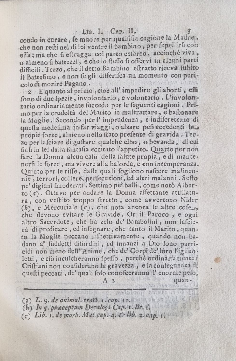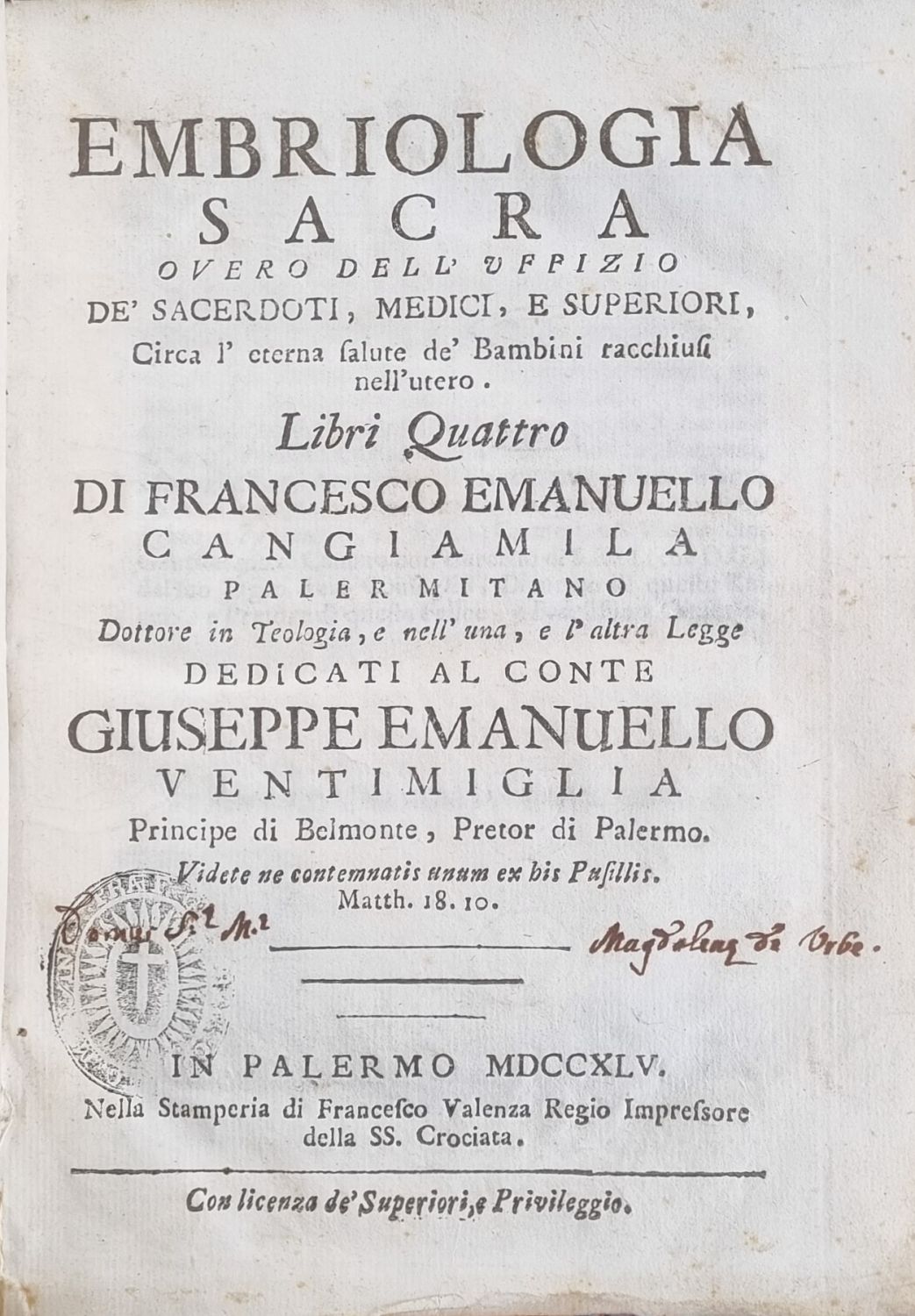 Graesse II,34; Wellcome II,295; Worldcat eviduje pouze 1 exmplář v Universitní knihovně v Lipsku.<br>Tištěno antikvou italsky, živá záhlaví, tištěné poznámky pod čarou, viněty, tučně tištěné versálky ve výši 3-4 řádků, konturové iniciály ve dvojitém jednoduchém rámečku na ilustrativním pozadí ve výši 5-10 řádků, tiskařské ozdůbky. Kniha se skládá ze čtyř průběžně paginovaných částí. Na konci obsah a rejstřík.<br>Dobová pergamenová vazba, při horním okraji hřbetu inkoustem napsaný název. Vazba ohmataná a místy zašpiněná, pergamenový pokryv místy lehce zkrabatělý. Na titulním listu razítko z 18. či 19. století a rkp. přípis "Magdalena di Urbe" (Řím), na rubu přední předsádky rkp. provenienční přípis z konce 18. století ".... Bibliotecq S. Maria Magdalena in Urbe" (stejný přípis na straně 80). Chybí příloha - mědirytinová rozkládací tabule s vyobrazením embrya v různých stádiích.<br>Francois-Emmanuel Cangiamila (1.1. 1702 Palermo - 7.1. 1763 Palermo), italský duchovní, kanovník metropole Palerma a provinční inkvizitor Království Sicílie. Nabízené dílo pojednává o soukromé zpovědi, osobní hygieně a zabývá se též právem spojeným s medicínou ve vztahu k těhotným ženám. Kniha též pojednává o důležitosti křtu potracených dětí, neboť duše je dle jeho argumentů naplněna již od početí, bez křtu by nenarozené děti byly odsouzeny k věčnému limbu. Kniha vzbudila velký ohlas a již v průběhu 18. století byla přeložena do několika jiných jazyků, mimo jiné do novořečtiny.