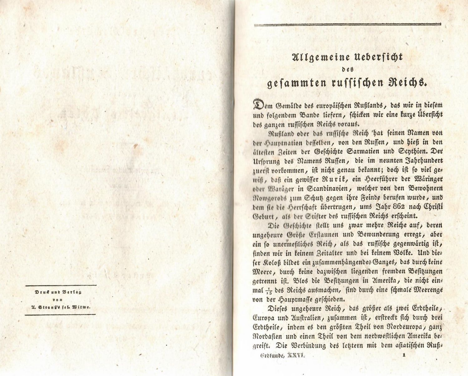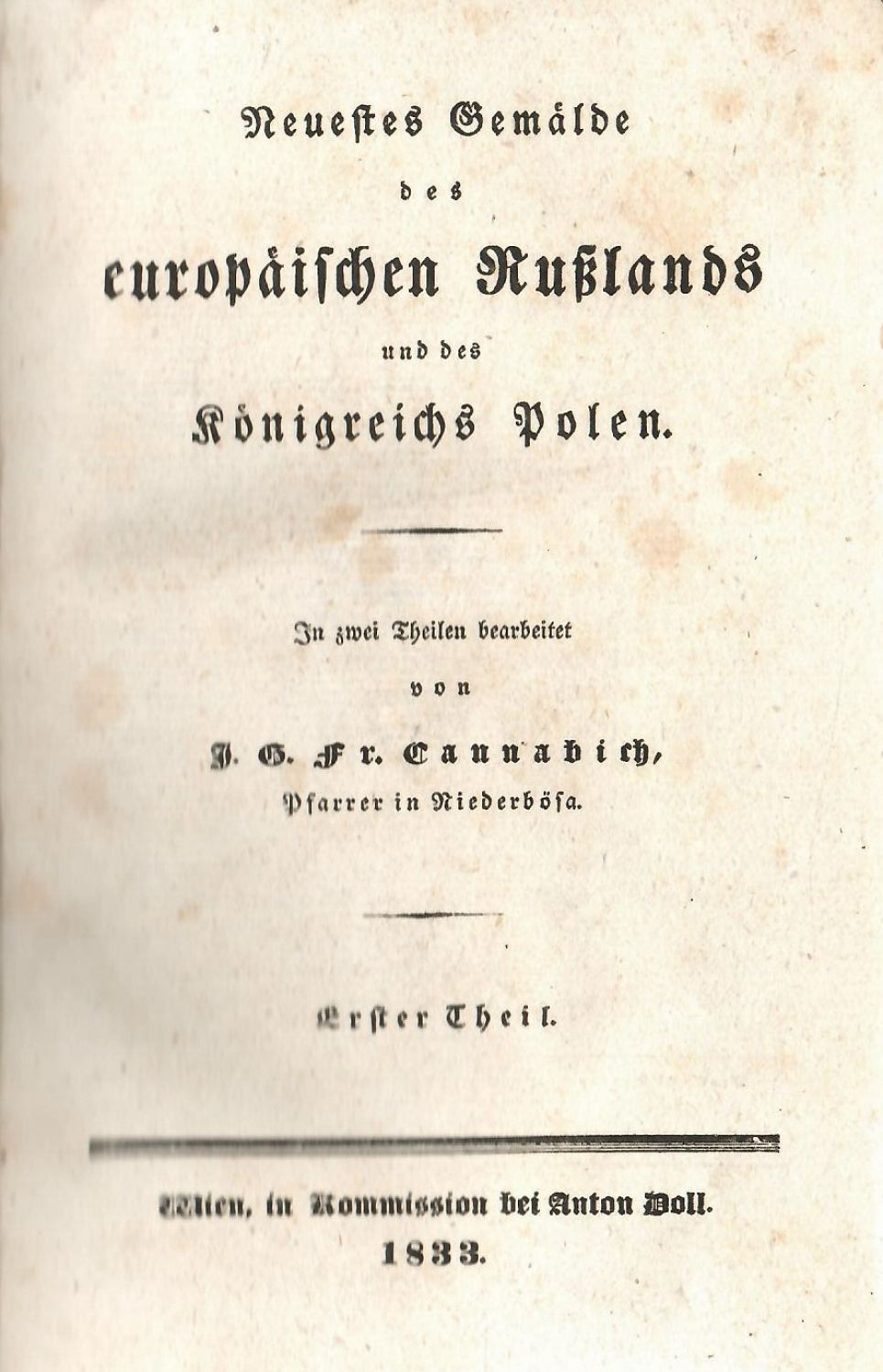 Tištěno švabachem, živá záhlaví, tištěné poznámky pod čarou.<br>Dobové vazba s deskami potaženými mramorovaným papírem, kožené hřbety a nárožnice. Ve hřbetech ve druhých polích temně červené kožené štítky s tlačeným jménem autora a pomocným názvem, v pátých polích zelený kožený štítek s názvem, jednotlivá pole vymezená tlačenou a zlacenou tyčí z rostlinného ornamentu, barvené ořízky. Mírně naražené rohy, zlacení ve hřbetu místy vybledlé.<br>Johann Günther Friedrich Cannabich (21.4. 1777 Sondershausen - 2.3. 1859 tamtéž) německý učitel, pastor a geograf.