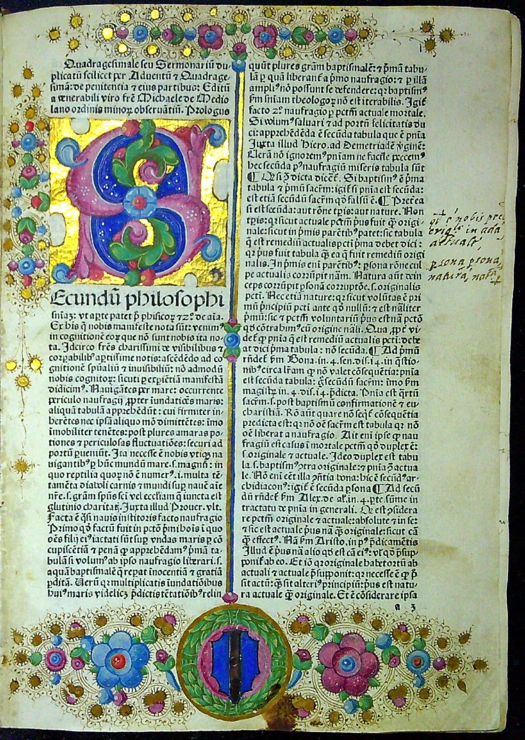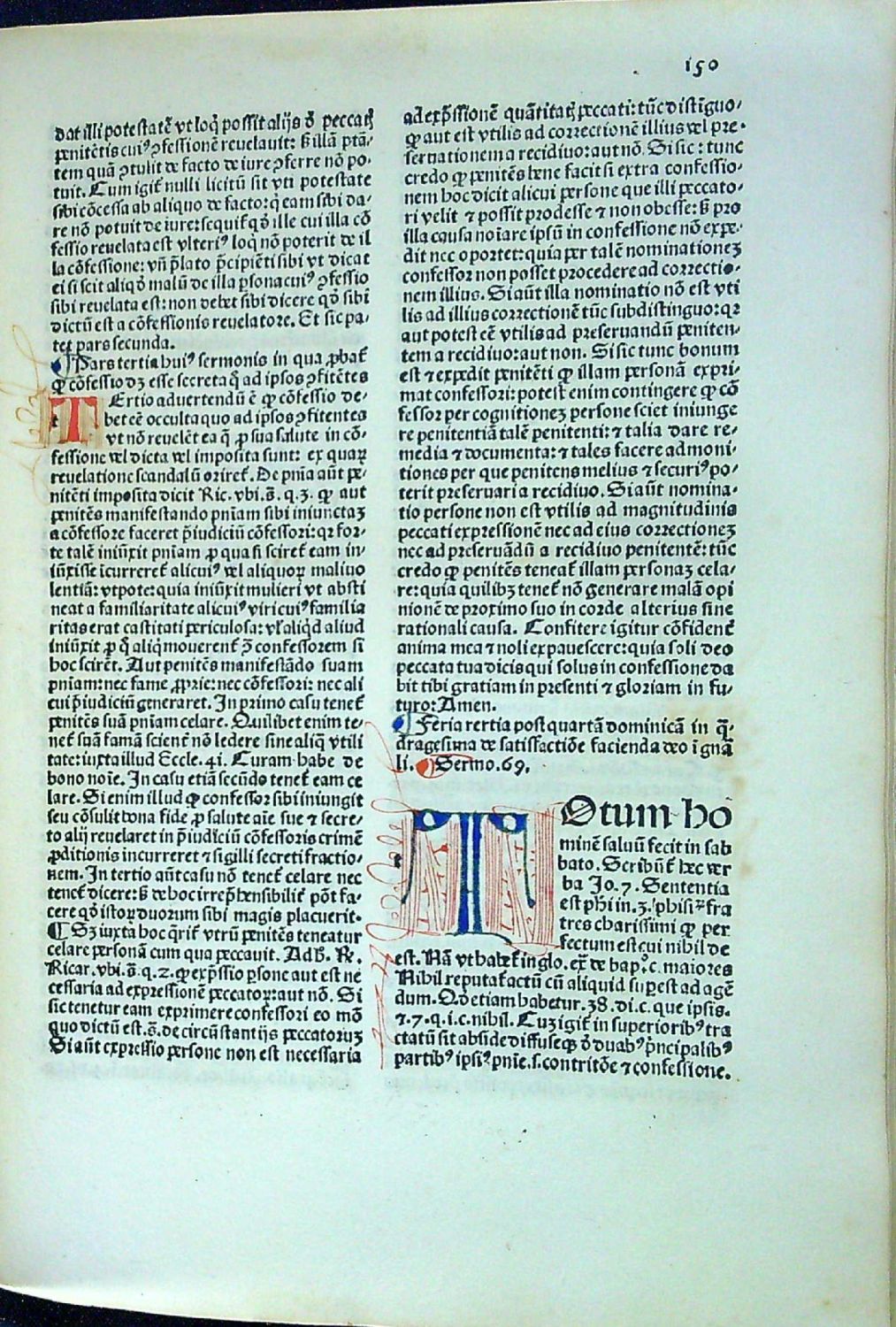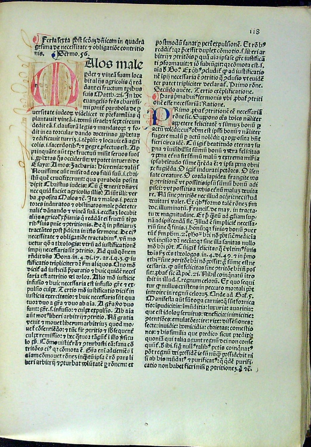 ISTC ic00196000; HC 4506; Goff C196, GW 6131; BMC V,336<br>Tištěno rotundou v 50 řádcích, dvousloupcový tisk, arabská paginace listů při horním vnějším okraji (2 listy nepaginované pak paginace 1-221), signatury (a-y A-F8). Na foliu a3 vícebarevná malovaná iniciála olemovaná zlaceným rámem ve výši 16 řádků, při jejím vnitřním okraji zčásti zlacená rostlinná drolerie, stejná drolerie při horním okraji, sloupce oddělené malovanou, zčásti zlacenou tyčí, při spodním okraji malovaná kartuše, zčásti zlacená rostlinného dekoru. V textu řada kreslených modrých a červených iniciál ve výši 3-7 řádků na červeném podkladu s různě dlouhými lehce načrtnutými prostorovými rozvilinami, červené rubriky.<br>Vazba z tmavě hnědé hověziny z 18. století, ve hřbetu 5 vazů, ve druhém poli tlačené zkratka "PHILO", v ostatních polích tlačený ornament, desky vazby se lehce rozvírají, kůže vazby místy odřená a při spodním okraji hřbetu v délce cca 2 cm kůže ve hřbetu proděravělá. V textu místy staré rkp. marginálie, na foliu l8 (listu č. 86) při spodním okraji odstřižen kus nepotištěného papíru, list č. 215 při spodním okraji mírně roztřepený, na konci pod kolofónem světle černá skvrna od inkoustu. Chybí poslední nepotištěný list. Knižní blok místy lehce uvolněný. Přes popsané závady však ve stavu velmi dobrém.<br>Michael de Carcano či Michael de Carcanis de Mediolano (1427 - 1484), byl italský františkánský kazatel narozený v milánské šlechtické rodině. Roku 1442 vstoupil do řádu Františkánů a stal se potulným kazatelem. Patřil též k zakladatelům charitativní úvěrové instituce "Montes Pietatius". Ve svých kázáních často brojil proti lichvě, kterou spojoval výhradně se Židy (již v jeho době si řada křesťanských lichvářů účtovala mnohem vyšší úrok než židovští věřitelé). Jeho antisemitské projevy výrazně podpořily pronásledování Židů v Itálii. Nabízená kniha je prvním knižním vydáním jeho kázání.<br>Nicolaus von Frankfurt byl významný tiskař původem z Německa, který působil v letech 1473-1516 (v letech 1473 až 1477 spolupracoval s Franz Rennerem a na vydání knih se podílel spíše finančně) v Benátkách a vytiskl nejméně 105 knih.