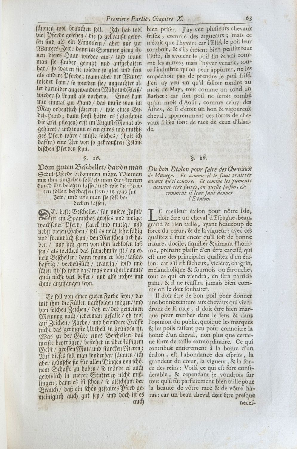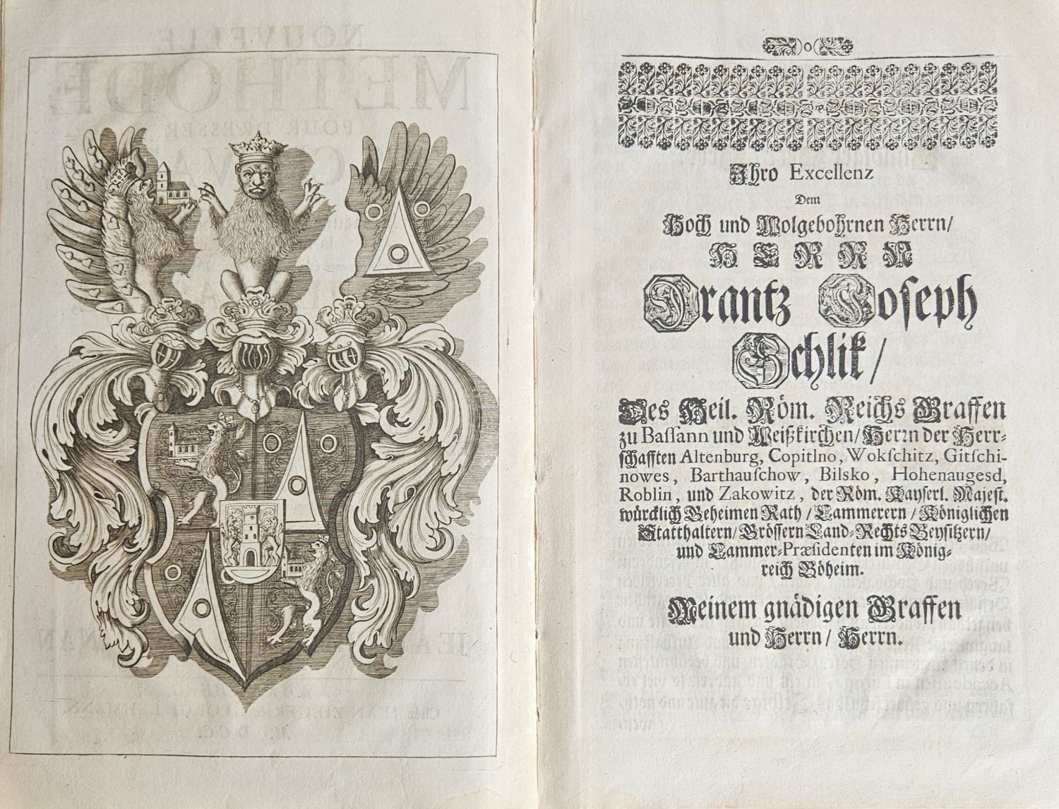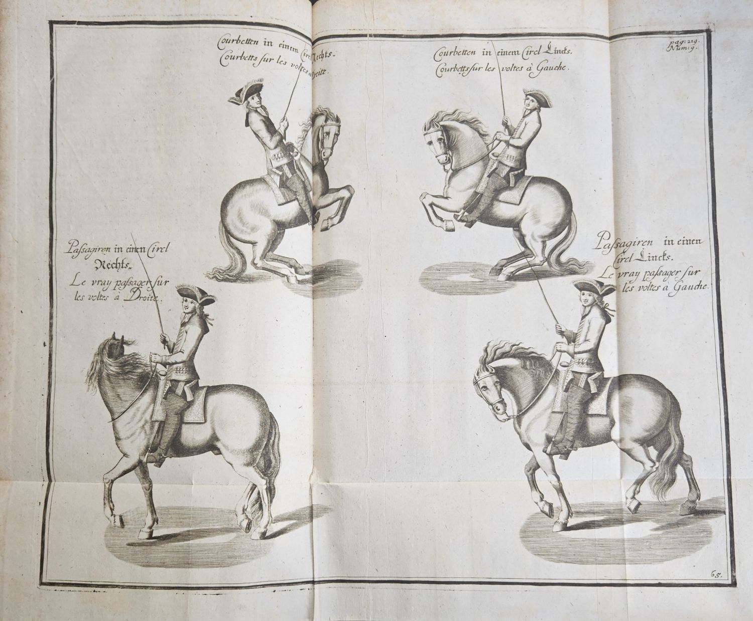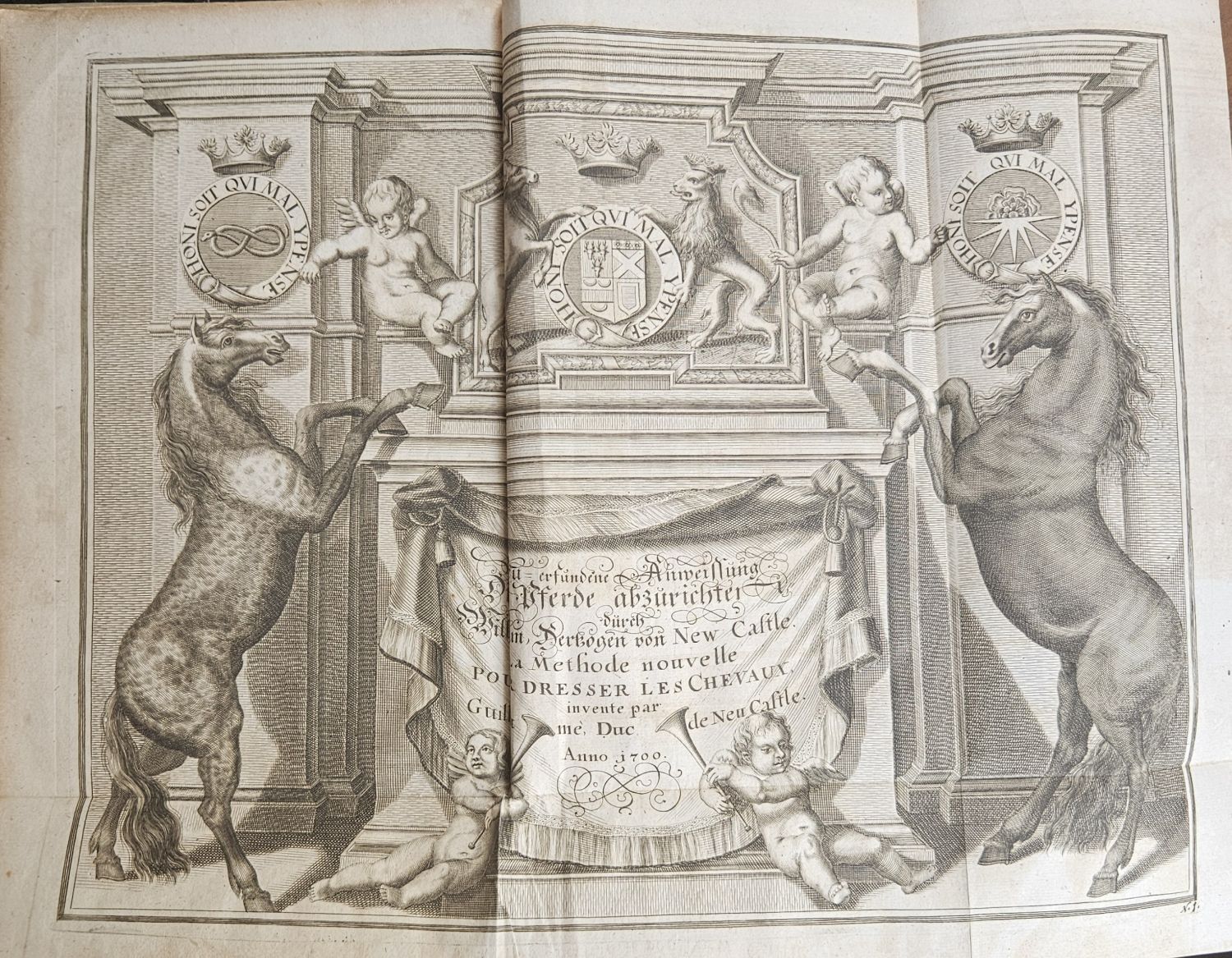 Lipperheide Tc31; Graesse II,93; Nissen ZBI 852.<br>Předtitul, dva titulní listy (prvý německý červeno-černě tištěný), druhý francouzský. Tištěno ve dvou sloupcích (v levém německý text, v pravém francouzský), živá záhlaví od sazby oddělená jednoduchou linkou. Na rubu francouzského tit. listu celostr. mědirytina s vyobrazením erbu hrabat Šliků, v úvodu tištěná dedikace hraběti Františkovi Josefovi Šlikovi. Dřevořezové viněty, pásové vlysy z ornamentů, květin, ilustrací, konturové iniciály zalomené do výše 4-7 řádků, tučně tištěné iniciály ve výši 2 řádků, jednoduché mizící linky. Kniha se skládá ze 4 částí průběžně paginovaných.<br>Dobová pergamenová vazba, na předním přídeští u spodního okraje pap. štítěk z počátku 20. století "Günther Leisten Antiquar Köln". Vazba místy zašpiněná a odřená, naražené rohy, papír místy zahnědlý, tři rytiny při spodním okraji lehce natržené a několik mírně pomačkaných.<br>William Cavendish, 1. vévoda z Newcastlu (1593 - 25.12. 1676) anglický dvořan a podporovatel umění, proslul jako chovatel koní a mecenáš dramatika Bena Johnsona, podporoval též Hobbese, Descarta a Gassendiho. Roku 1648 emigroval do Rotterdamu a poté do Antverp, kde založil slavnou jízdárnu. Roku 1660 se vrátil do Anglie a podařilo se mu získat zpět část svých konfiskovaných statků. Namísto politiky se pak po zbytek života věnoval koním. Roku 1658 publikoval svoji první práci o jezdectví a roku 1667 druhou, námi nabízenou.