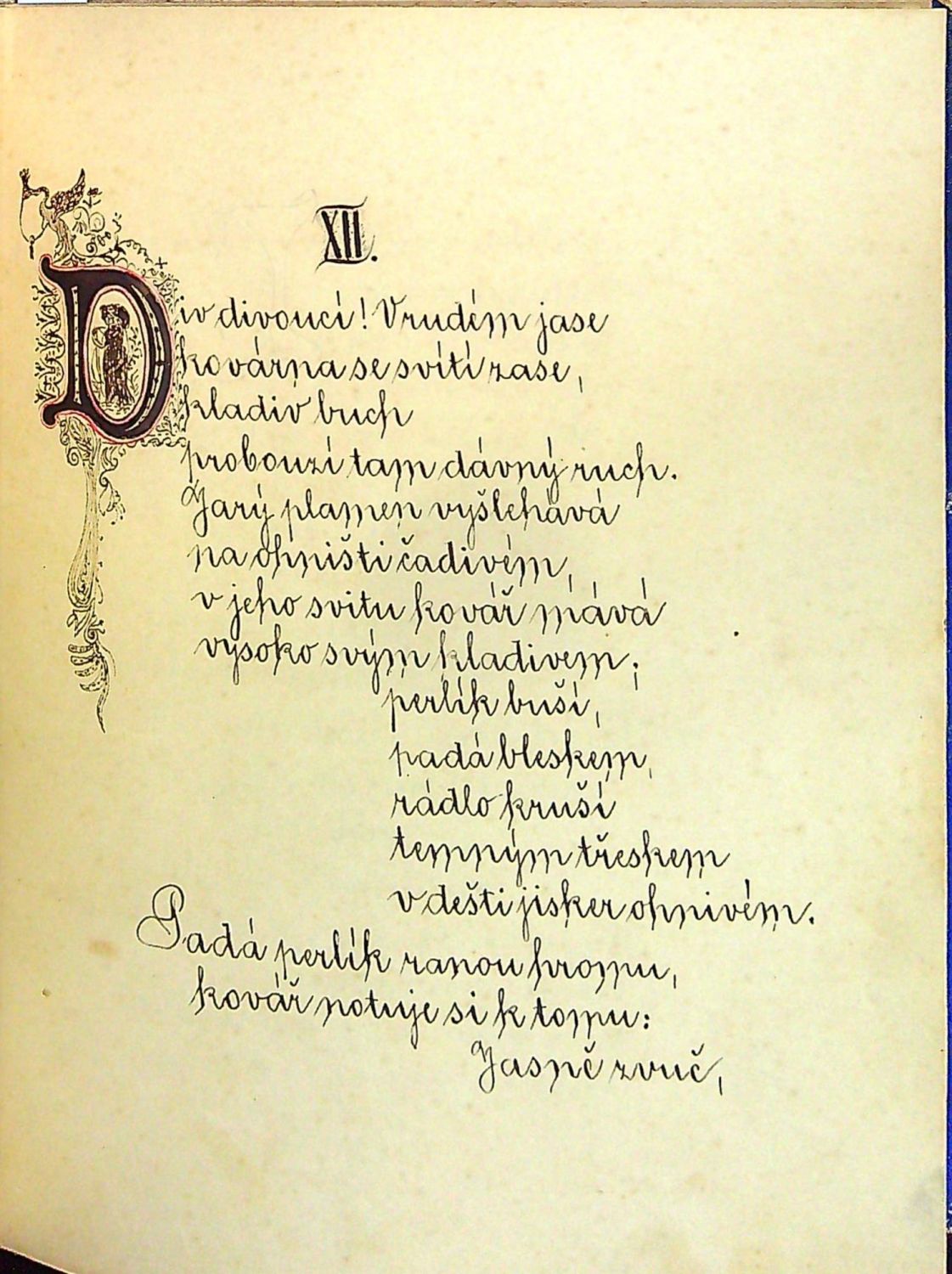 Kaligraficky psaný rukopis, římsky číslované jednotlivé sloky, plné iniciálky, iniciálky zasazené v čárových dvoubarevných kompozicích, tučně malované plné iniciály ve výši 3-4 řádek zasazené v rostlinné, ornamentální či ilustrativní kompozici, malované viněty rostlinné, ornamentální, ilustrativní.<br>Plátěná vazba z 80. let 19. století od knihaře Jana Floriána Šaška. Na přední desce tlačený a zlacený rám z ornamentů, uvnitř rámu tlačené zrcadlo zdobené v rozích ornamentem, uvnitř zrcadla tlačený a zlacený název, na desce zadní při spodním okraji tlačené jméno knihařovo. Vazba ohmataná a místy odřená, ve hřbetu místy potrhaná, na rubu přední předsádky jméno jednoho z předchozích majitelů "Ignát Vavera". <br>Pravděpodobně opis prvního vydání z roku 1883, které bylo konfiskováno. II. vydání vyšlo roku 1892 v USA. - Jan Florián Šašek (1836 Žďár nad Sázavou - 11.10. 1889 Velké Meziříčí) od roku 1869 žil ve Velkém Meziříčí, kde nejprve založil knihkupectví, později knihtiskárnu, knihvazačství a nakladatelství. Krom jiného vydával i první učitelský časopis "Národ a škola", později i měsíčník "Vesna". Byl zakládajícím členem učitelské jednoty "Budeč".