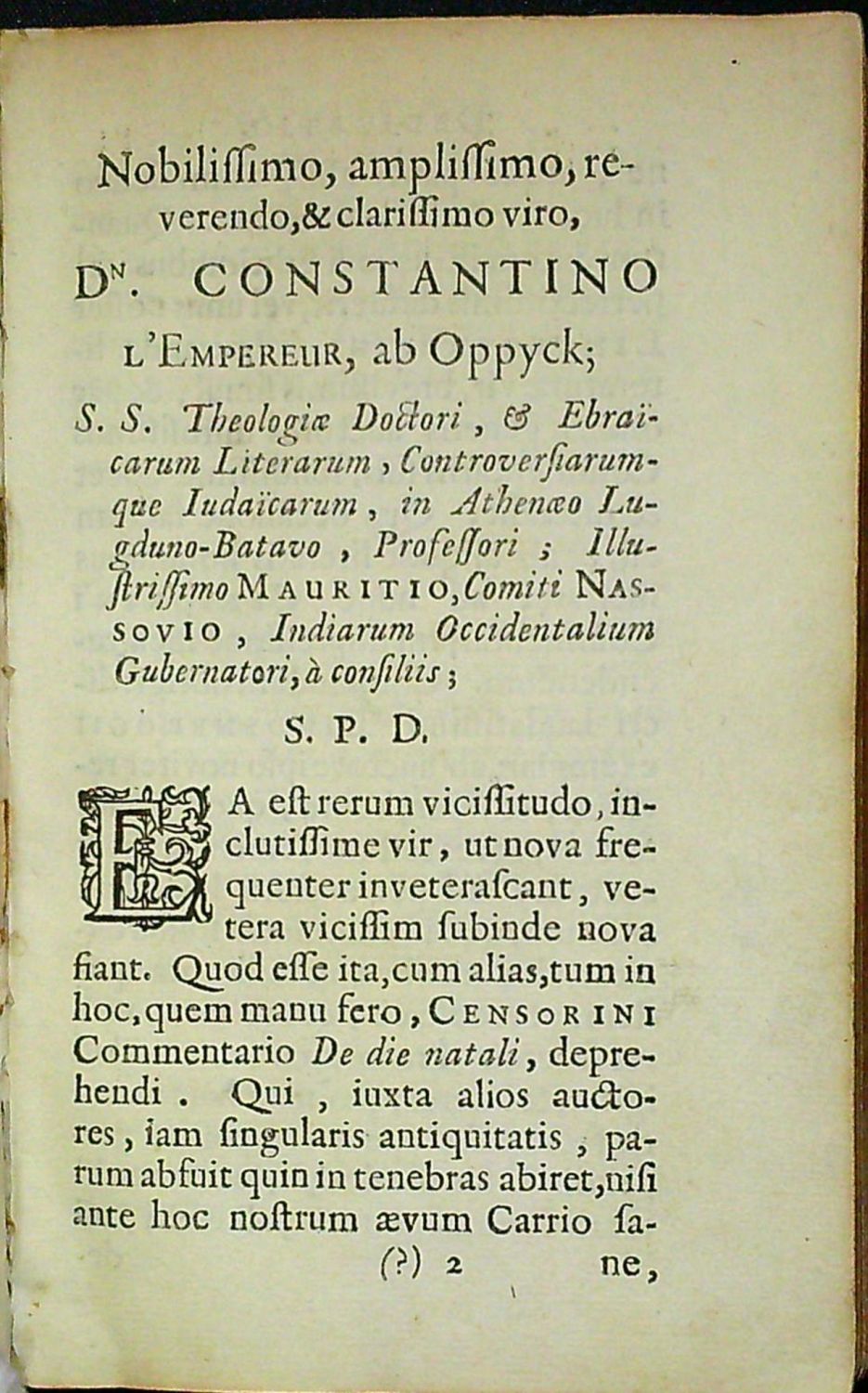 Caillet 2135<br>Na tit. listu dřevorytová viněta, konturové iniciály na rostlinném pozadí zalomené do výše 3-5 řádků, tučně tištěné versálky ve výši 2 řádků, živá záhlaví, řecká slova alfabetou. V textu 6 schematických vyobrazení a mezi str. 88-89 rozkládací příloha s diagramem. K vydání připravil Henric Lindenbrogius.< Vazba z 18. století s kartonovými deskami potaženými mramorovaným papírem a pergamenovým hřbetem, při horním okraji hřbetu perem napsaný název, barvené ořízky. Papír na deskách ohmataný a místy odřený, naražené rohy. Tit. list zašpiněný, při vnitřním jeho okraji dolitý papírNa tit. listu starý provenienční přípis "Ex libris Jo. Henr. Abelis....". <br>Censorinus byl římský gramatik a spisovatel ze 3. století našeho letopočtu. Nabízená práce byla napsána v roce 238 a autor ji dedikoval svému mecenáši Quintovi Caerelliovi jako dárek k narozeninám. V prvé části se autor věnuje historii člověka a různých názorů (píše o Chaldejcích, Egyptu, době mytické a historické, o názorech Pythagorových), píše o vlivu hvězd na život, o astronomii, hudbě, náboženských obřadech. V části druhé se zabývá chronologickými a matematickými otázkami, v díle jsou časté citace z děl Varra a Suetonia. <br>Heinrich Lindenbrog (10.2. 1570 Hamburk - 15.7. 1642 Gottorf), byl německý knihovník a filolog, od roku 1610 až do své smrti byl knihovníkem vévody Johanna Adolfa von Holstein a poté vévody Friedricha III. na zámku Gottorf.